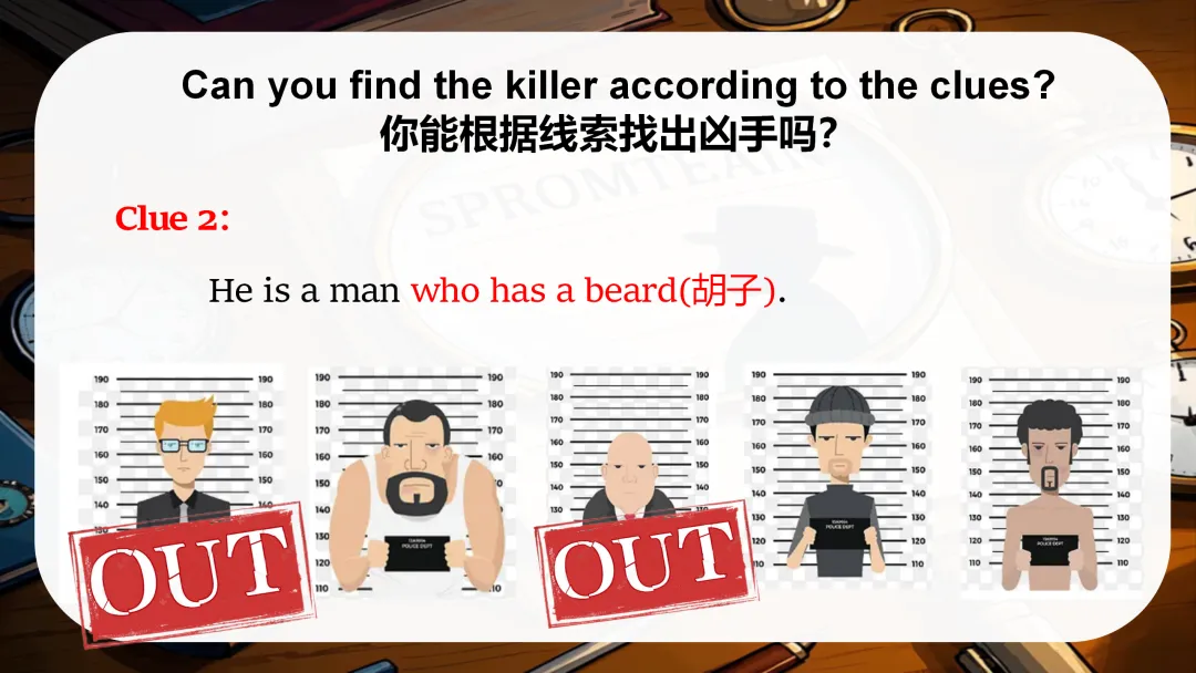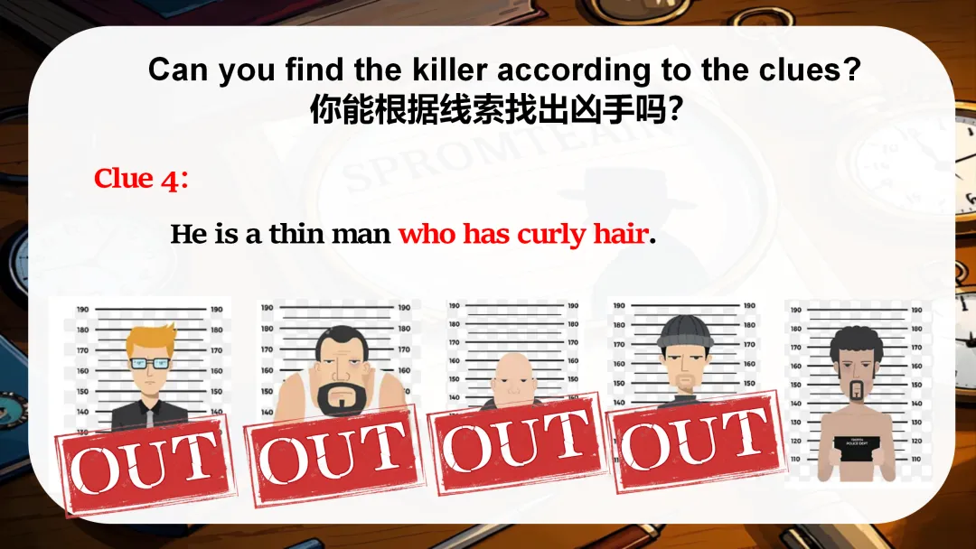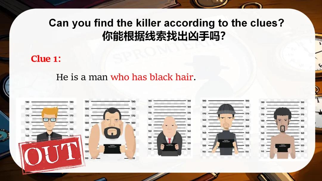 首先,咱们先看案情:“A man was killed!Who is the killer?” 一名男子遇害了,谁是凶手呢?警方给出了第一条线索:“He is a man who has black hair.” 大家先观察图片里的几位嫌疑人,看看谁符合“有黑色头发”这个特征?对啦,咱们可以把不符合的嫌疑人先排除掉。不过,在继续找线索之前,大家有没有发现这条线索里藏着一个特殊的句子结构?这就是咱们今天要重点学习的——定语从句。