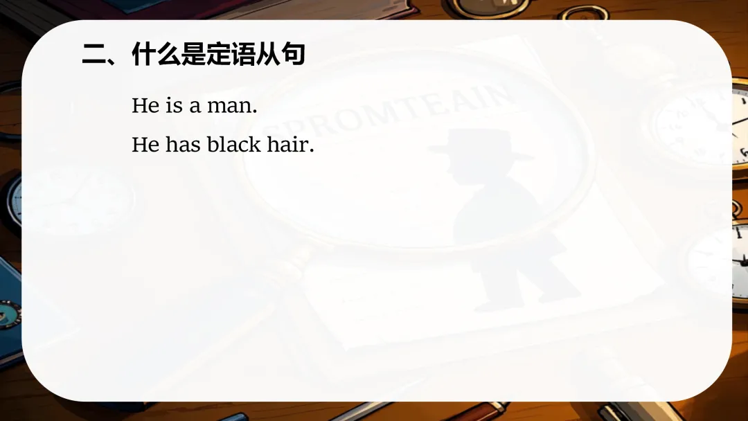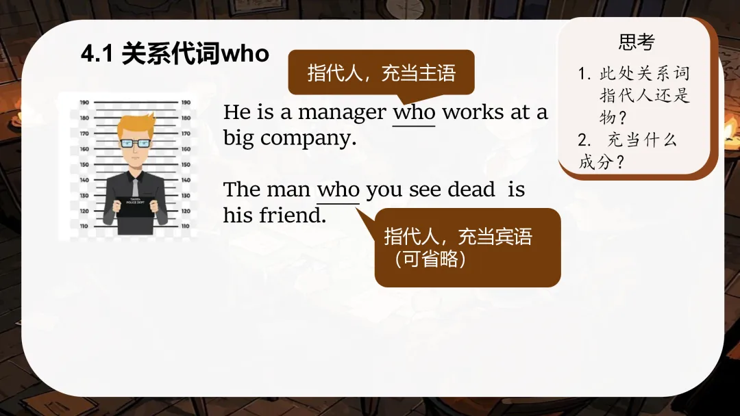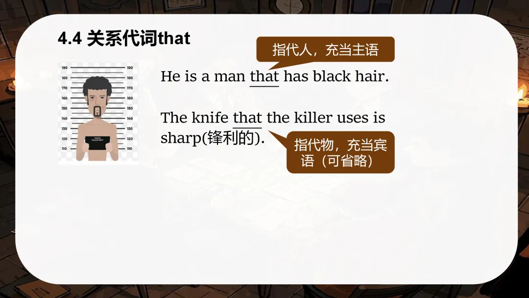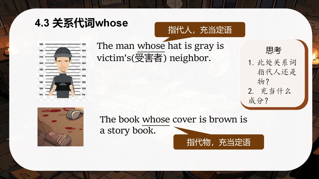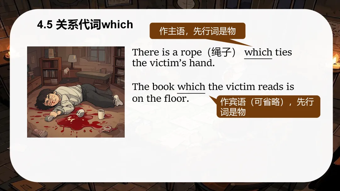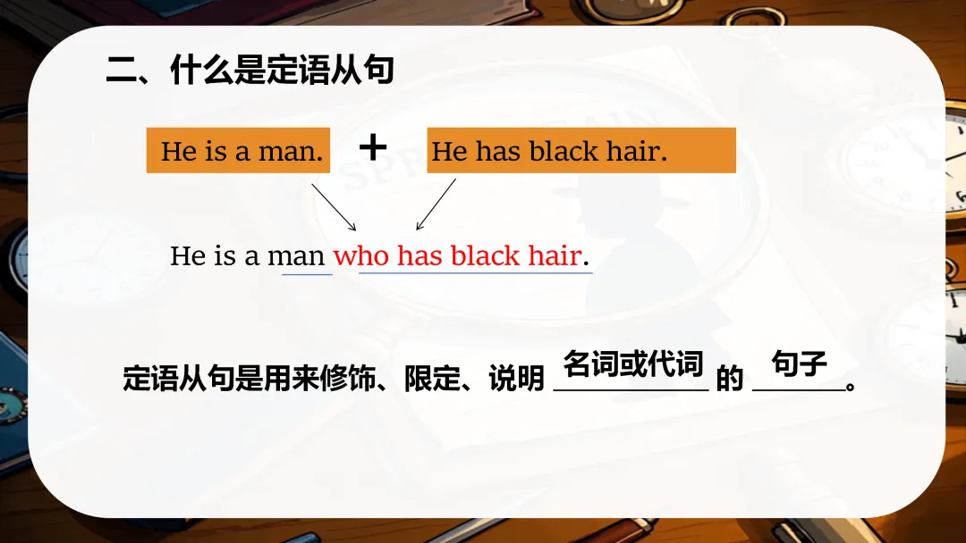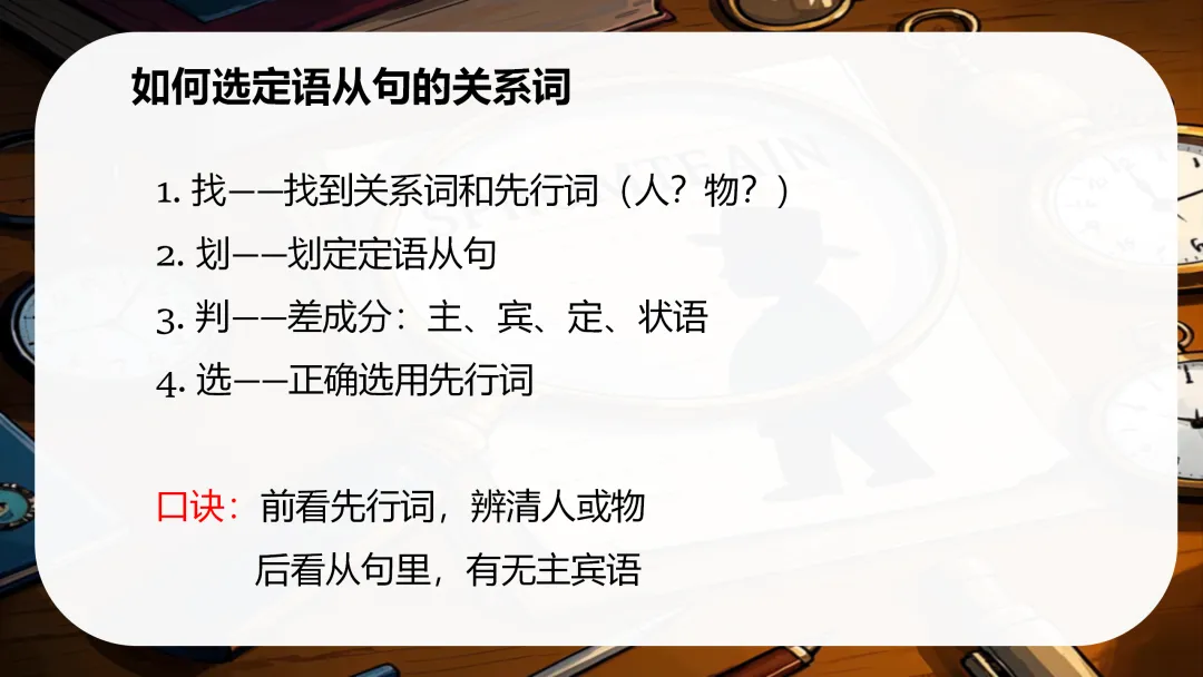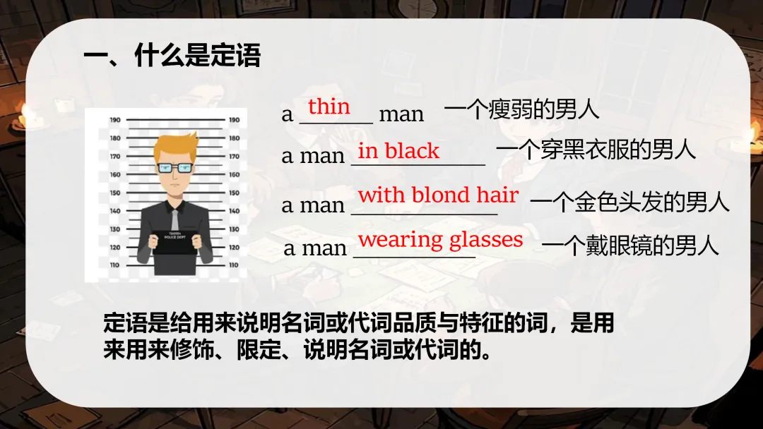 各位同学,大家好!今天咱们要换一种超有趣的方式学习英语语法——用剧本杀破解定语从句的奥秘!相信大家都看过侦探剧吧?当案件发生,侦探靠着一条条线索锁定凶手,今天咱们就来当一回“语法侦探”,通过分析案件线索,一步步揭开定语从句的神秘面纱,最后找出真正的凶手!