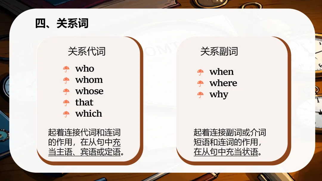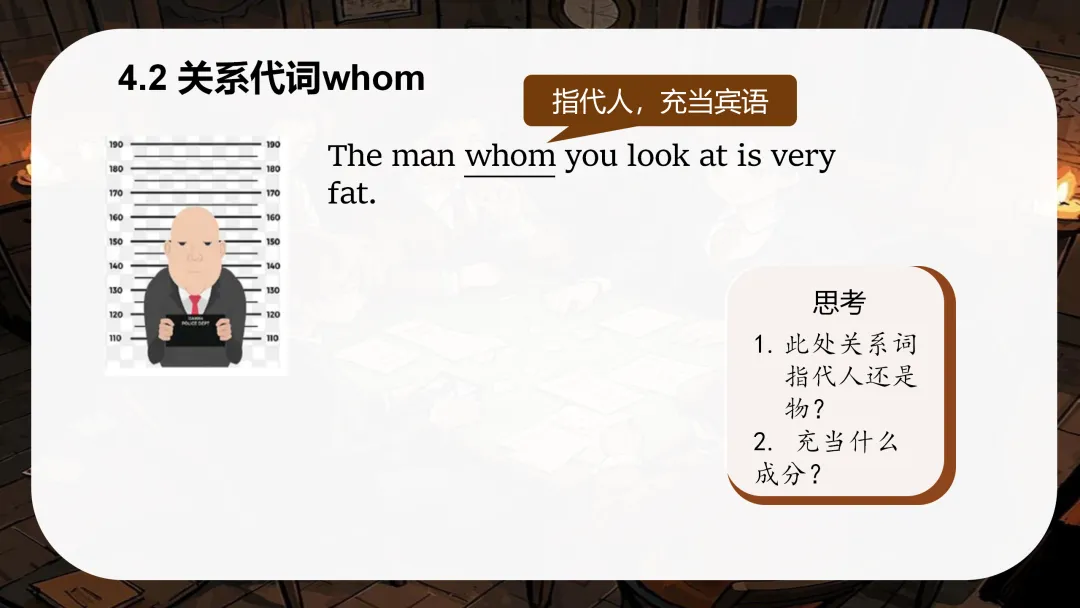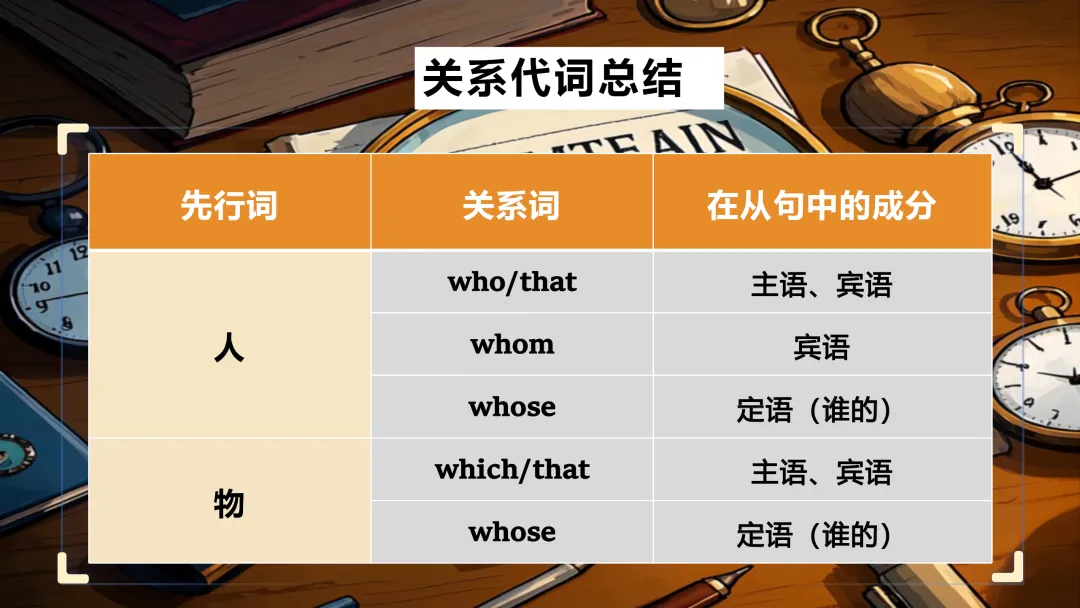 了解了基本结构,咱们重点学习“关系词”。关系词主要分为两大类:“whom”是“who”的宾格形式,只能作宾语,这是它和“who”的主要区别。