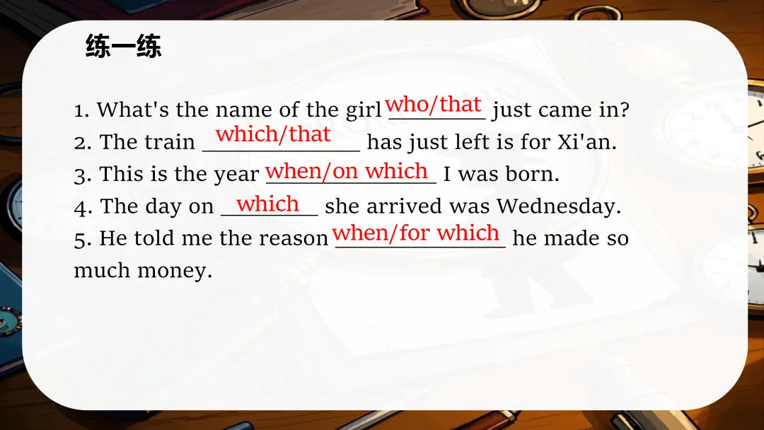 1. What's the name of the girl ________ just came in? 先行词是“the girl”(人),从句缺少主语,所以填who/that。
