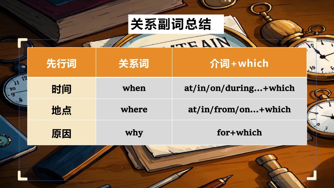 接下来,咱们学习第二类关系词——关系副词,常见的有when、where、why。它们的作用是在从句中充当状语,分别表示时间、地点和原因。