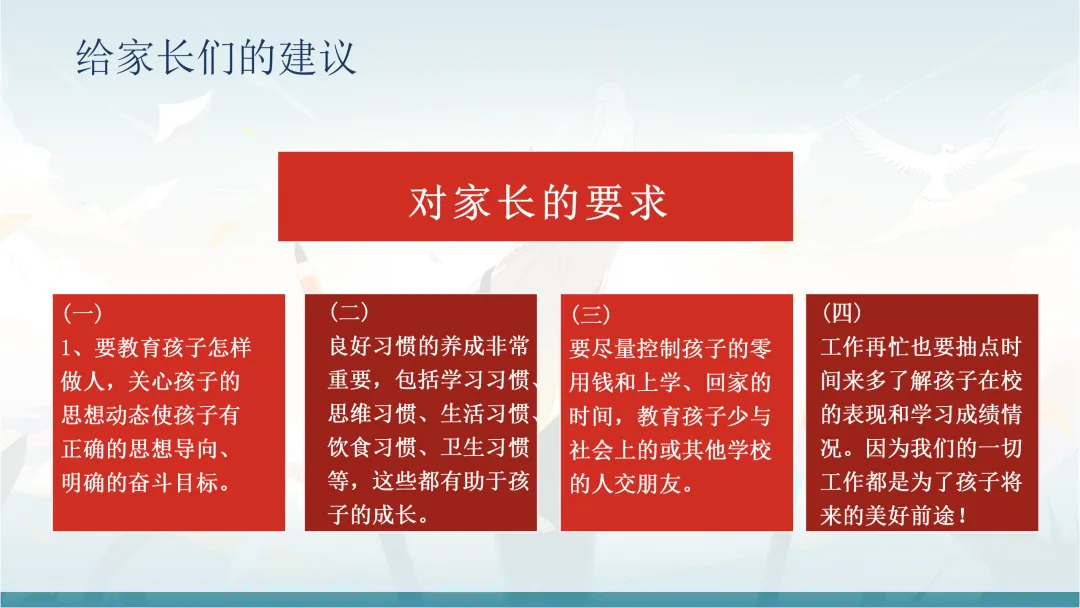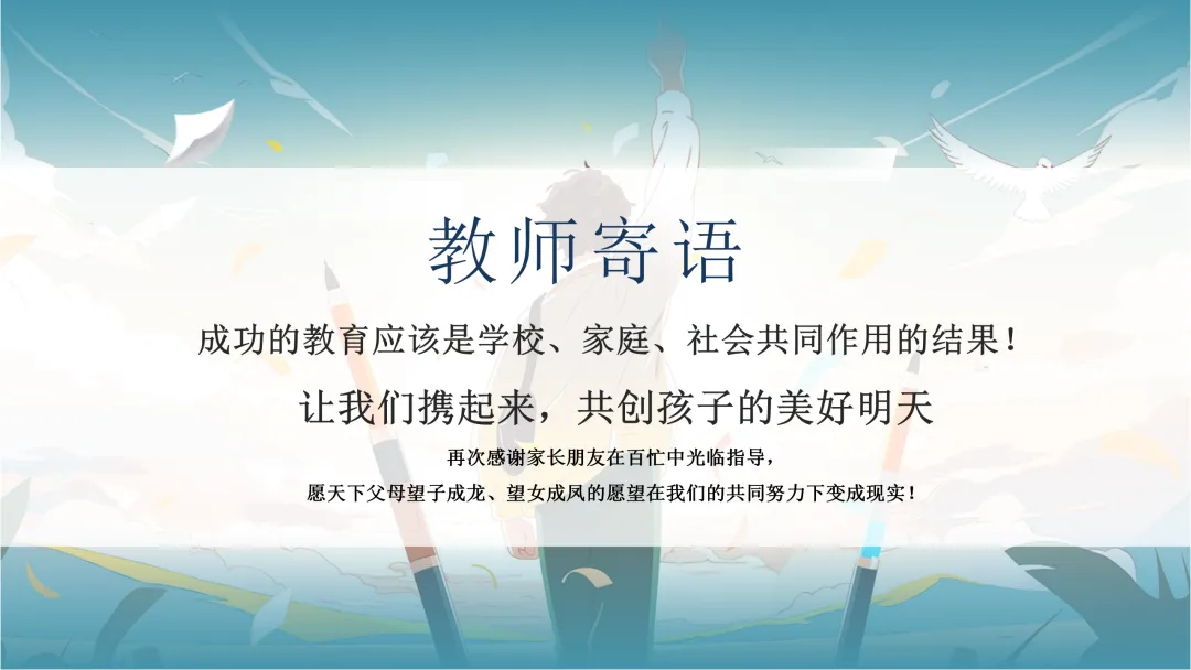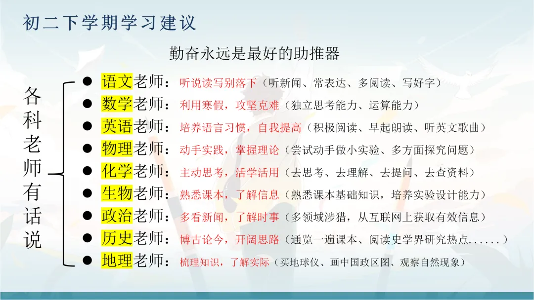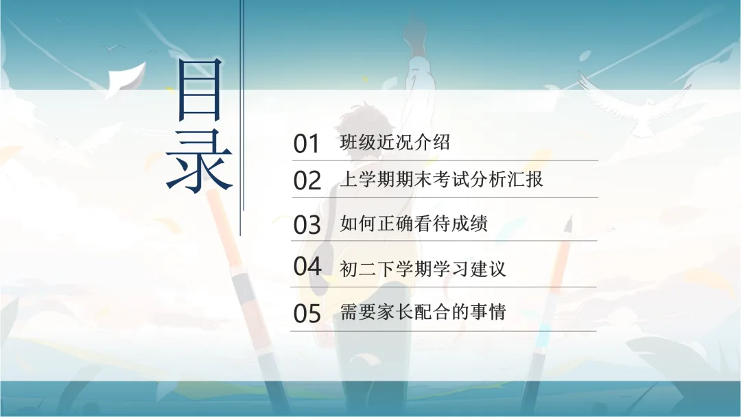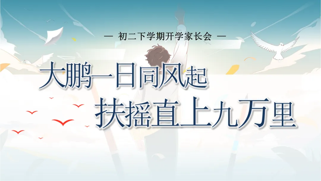 今天分享的是八年级初二春季下开学家长会的ppt课件和配套的发言稿,主题是《大鹏一日同风起,扶摇直上九万里》大鹏一日同风起,扶摇直上九万里