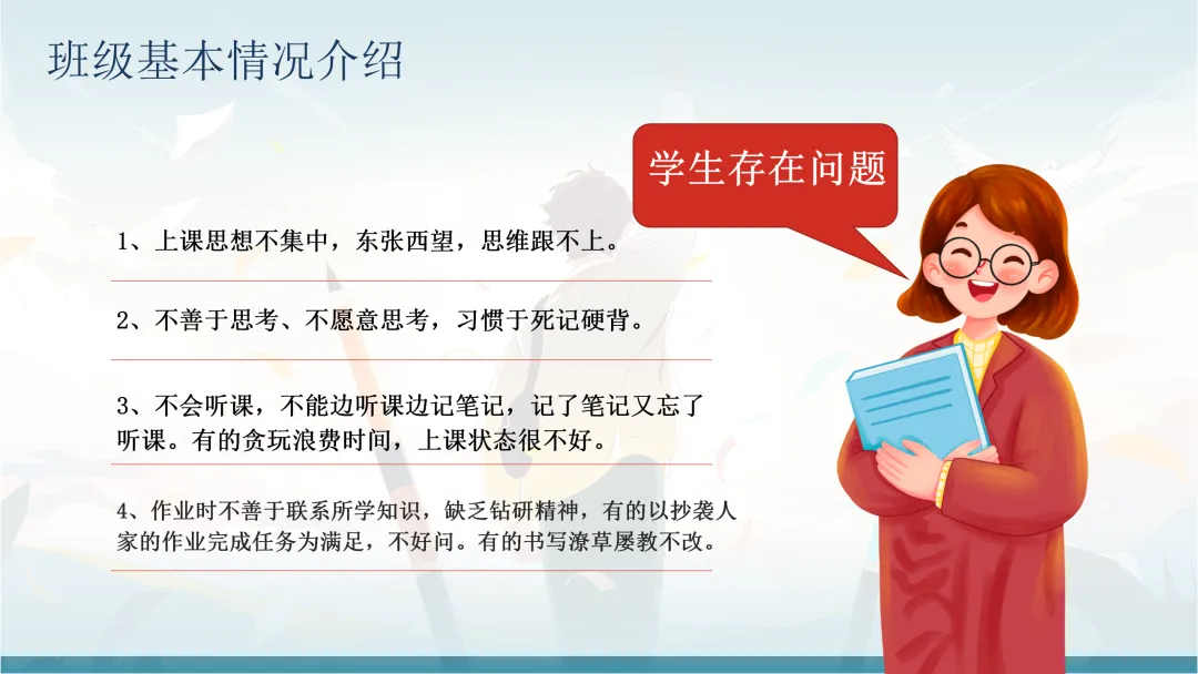 3、不会听课,不能边听课边记笔记,记了笔记又忘了听课。有的贪玩浪费时间,上课状态很不好。