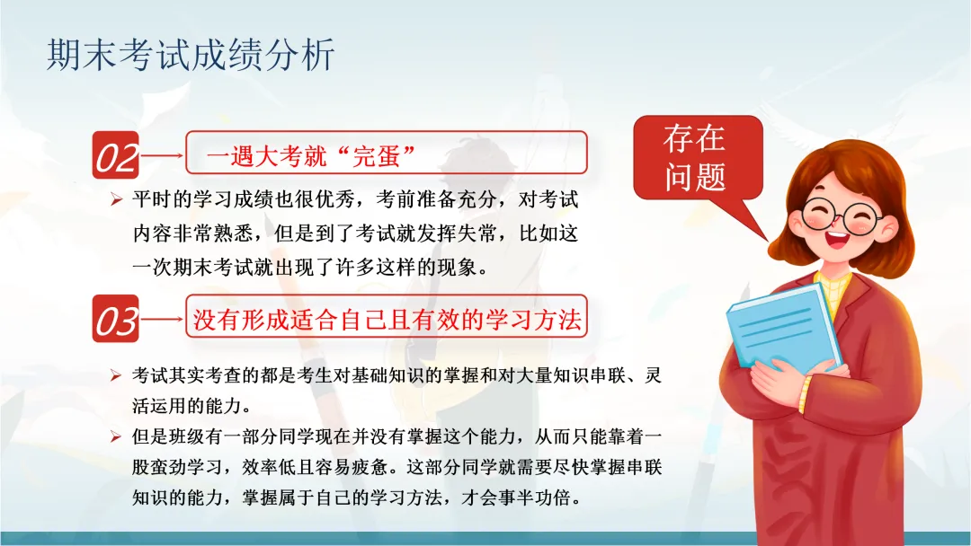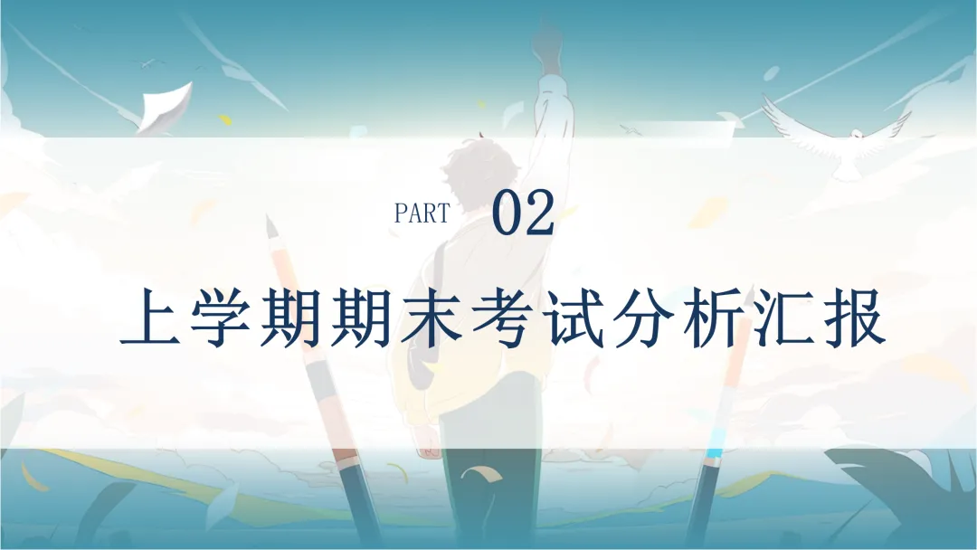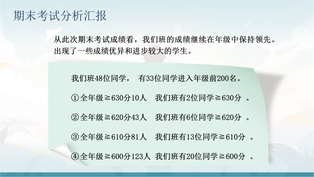 从此次期末考试成绩看,我们班的成绩继续在年级中保持领先。出现了一些成绩优异和进步较大的学生。