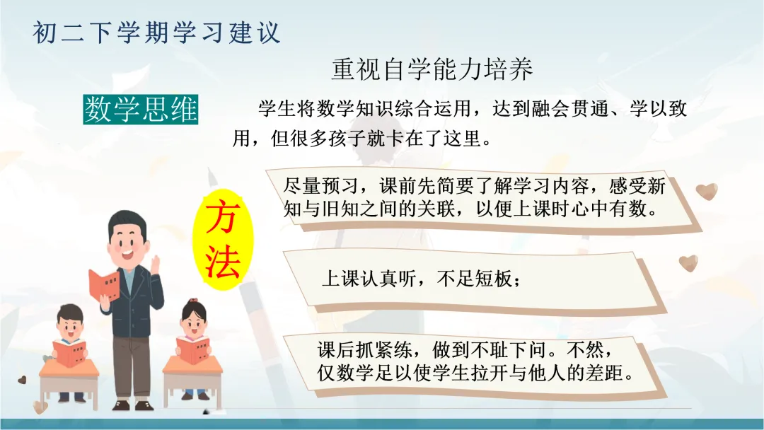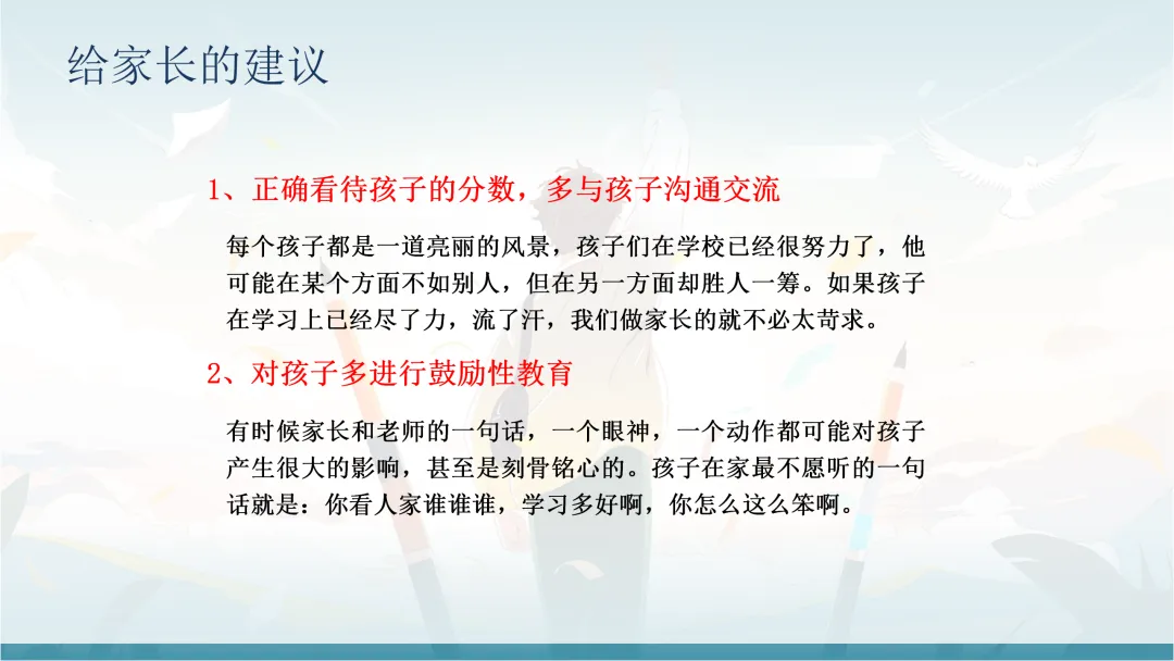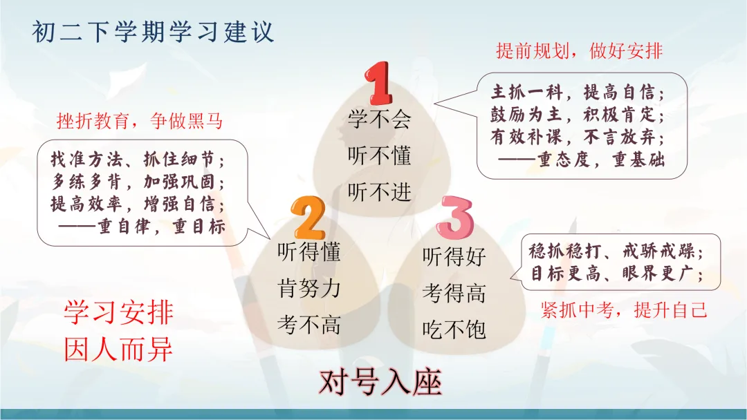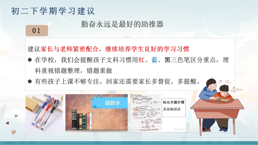 建议家长与老师紧密配合,继续培养学生良好的学习习惯。在学校,我们会提醒孩子文科习惯用红、蓝、黑三色笔区分重点,理科重视错题整理,错题重做。有些孩子上课不够专注,回家还需要家长学习安排因人而异