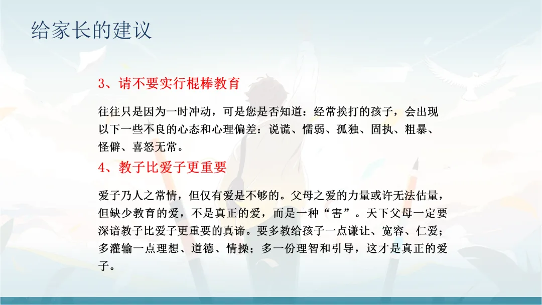 爱子乃人之常情,但仅有爱是不够的。父母之爱的力量或许无法估量,但缺少教育的爱,不是真正的爱,而是一种“害”。天下父母一定要深谙教子比爱子更重要的真谛。要多教给孩子一点谦让、宽容、仁爱;多灌输一点理想、道德、情操;多一份理智和引导,这才是真正的爱子。