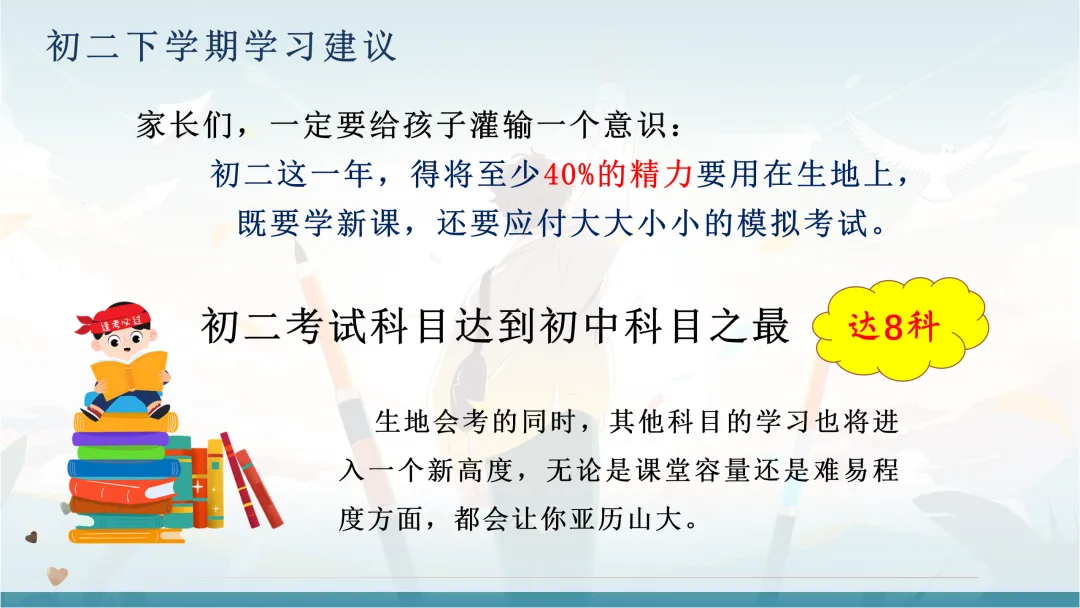 初二考试科目达到初中科目之最,生地会考的同时,其他科目的学习也将进入一个新高度,无论是课堂容量还是难易程度方面,都会让你亚历山大。