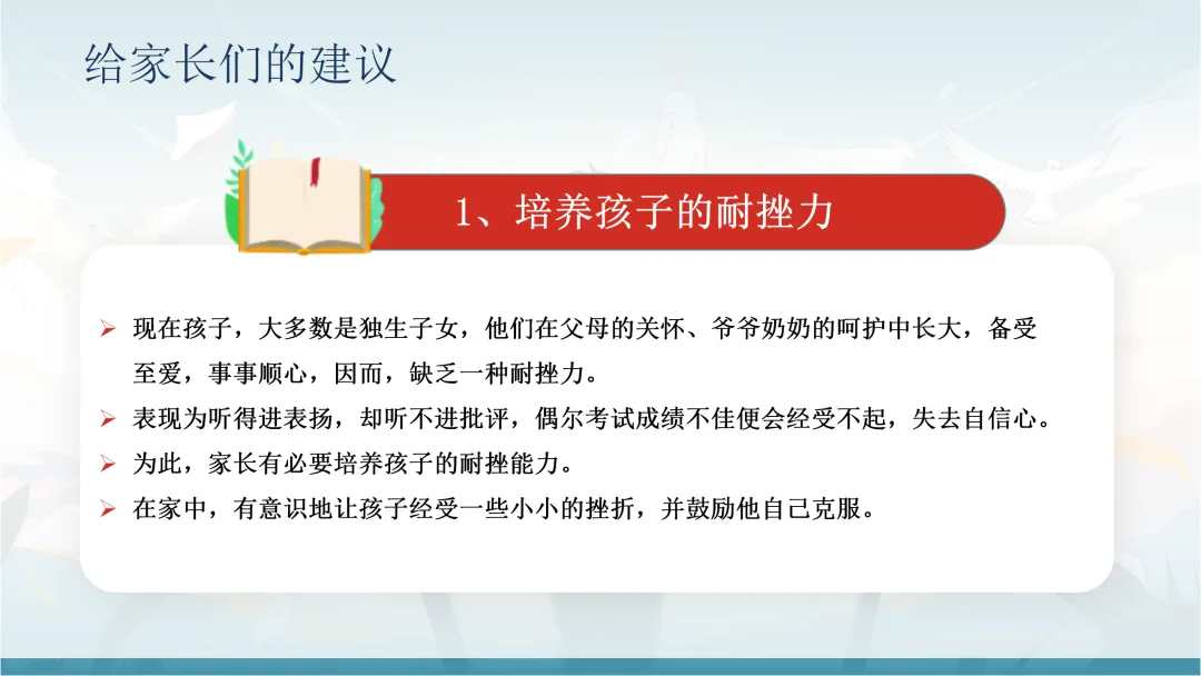现在孩子,大多数是独生子女,他们在父母的关怀、爷爷奶奶的呵护中长大,备受至爱,事事顺心,因而,缺乏一种耐挫力。表现为听得进表扬,却听不进批评,偶尔考试成绩不佳便会经受不起,失去自信心。为此,家长有必要培养孩子的耐挫能力。在家中,有意识地