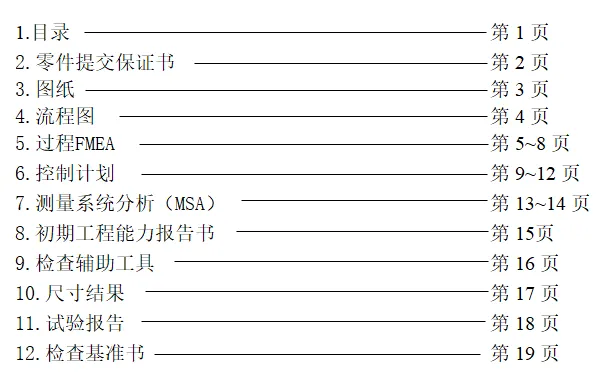 目录页严格按照PPAP要求列出了19项文件及其页码,方便查阅。