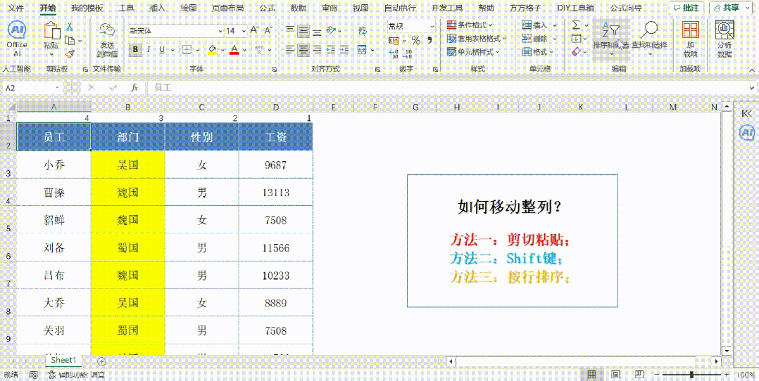 最后,删除插入的那一行数字序列,因为它们已经完成了自己的使命。你会发现,多列数据已经按照输入的数字序列顺序进行了移动,排列得井然有序。这种方法虽然看起来有些复杂,但一旦掌握,就能轻松应对多列数据移动的难题。