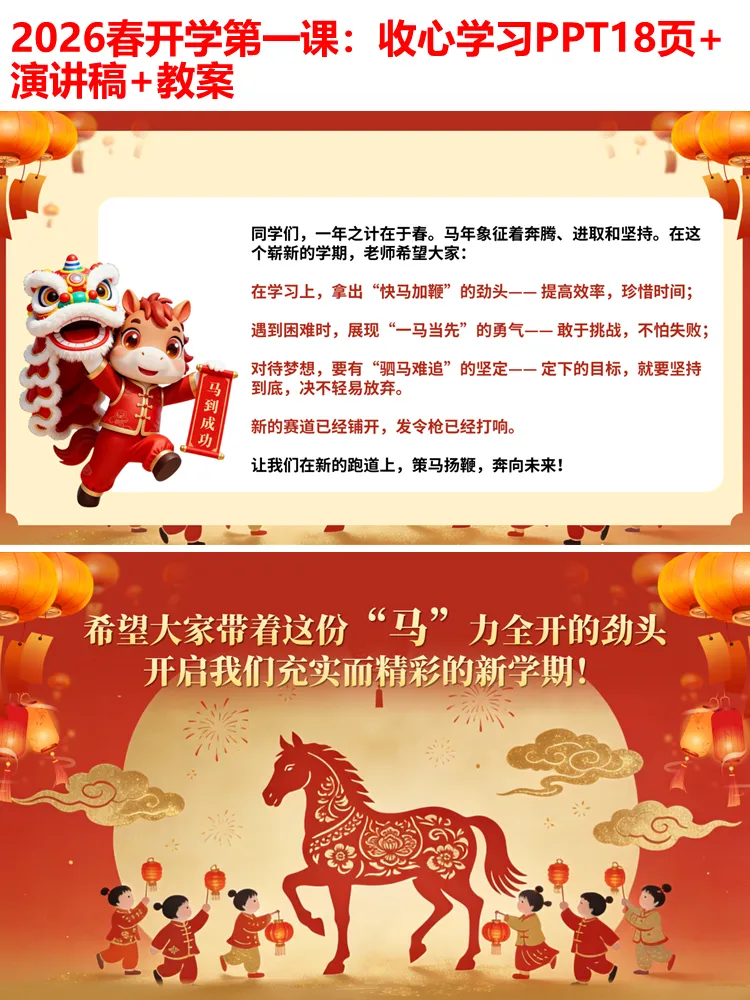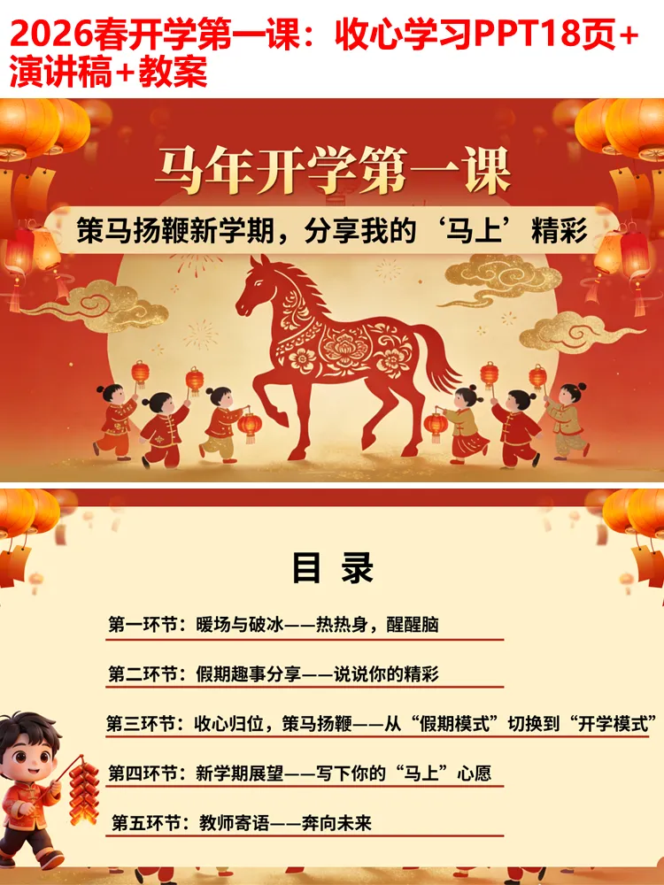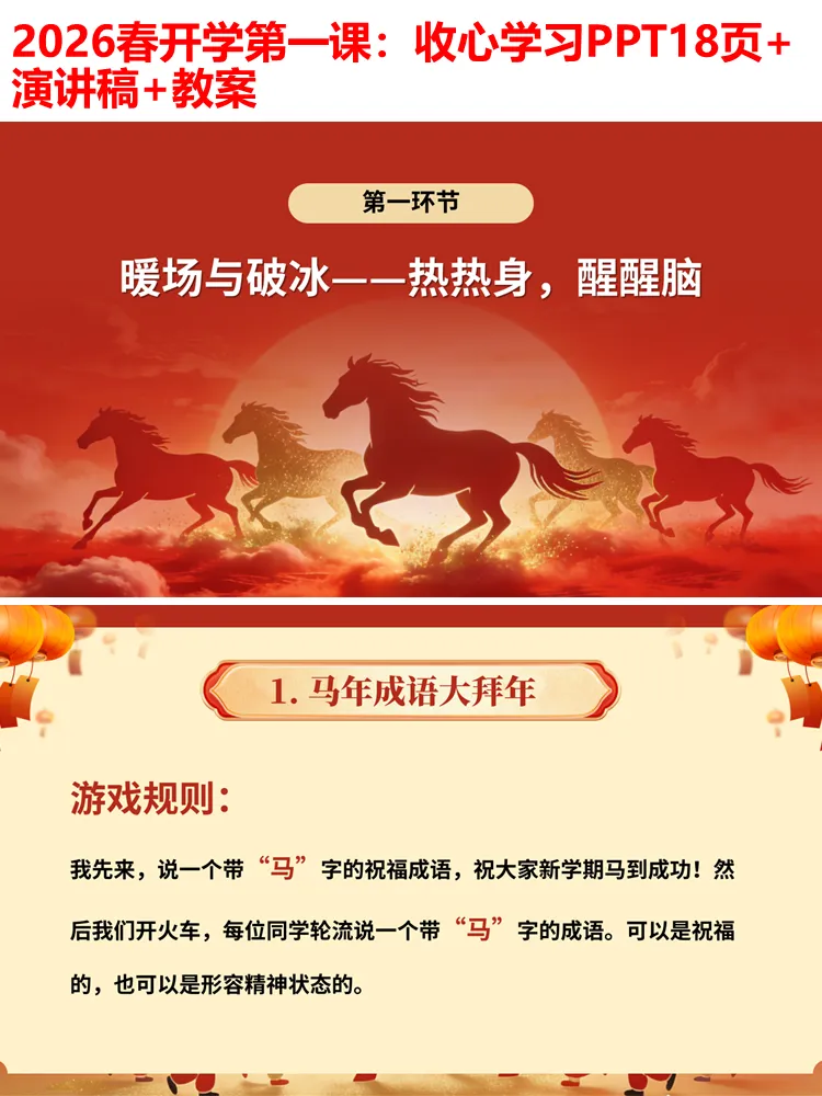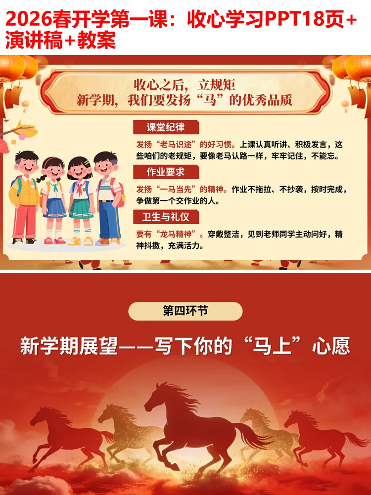整个PPT环节流畅、逻辑清晰,无需额外修改,可直接用于小学各学段开学第一课、开学主题班会,全程融入马年元素,兼顾趣味性、实用性和教育性,既能帮助学生快速收心,也能传递积极向上的学习态度,为新学期的开启奠定良好基础。