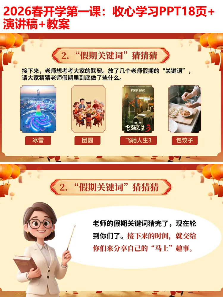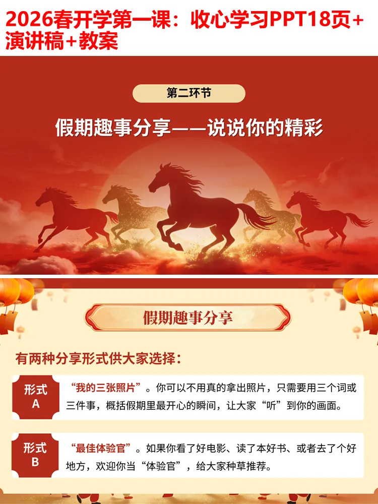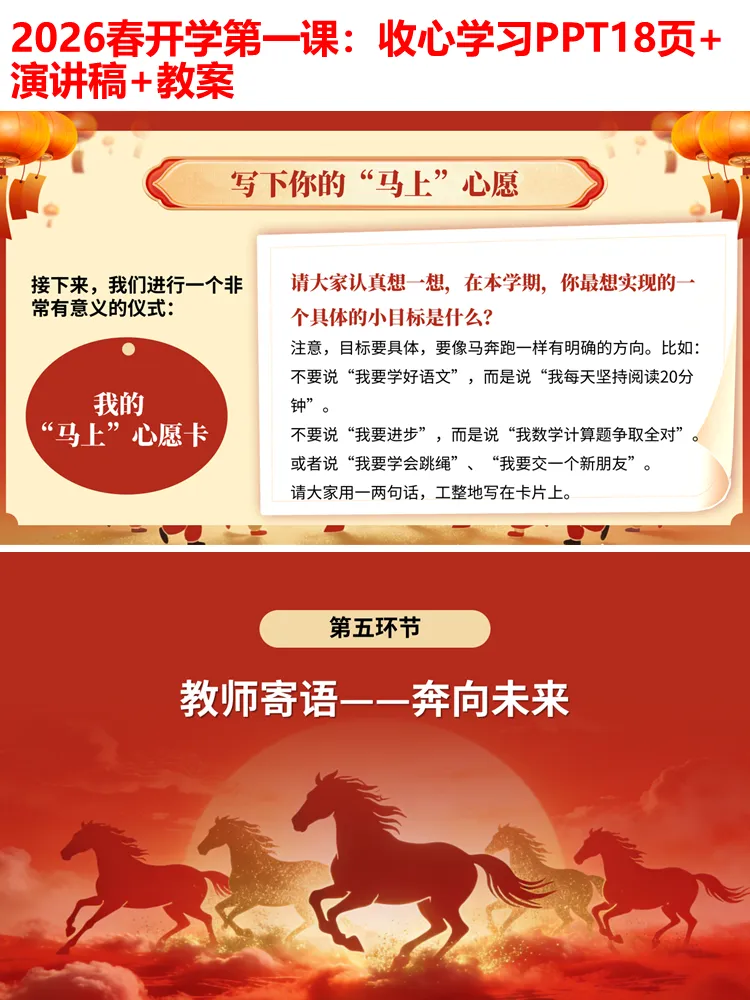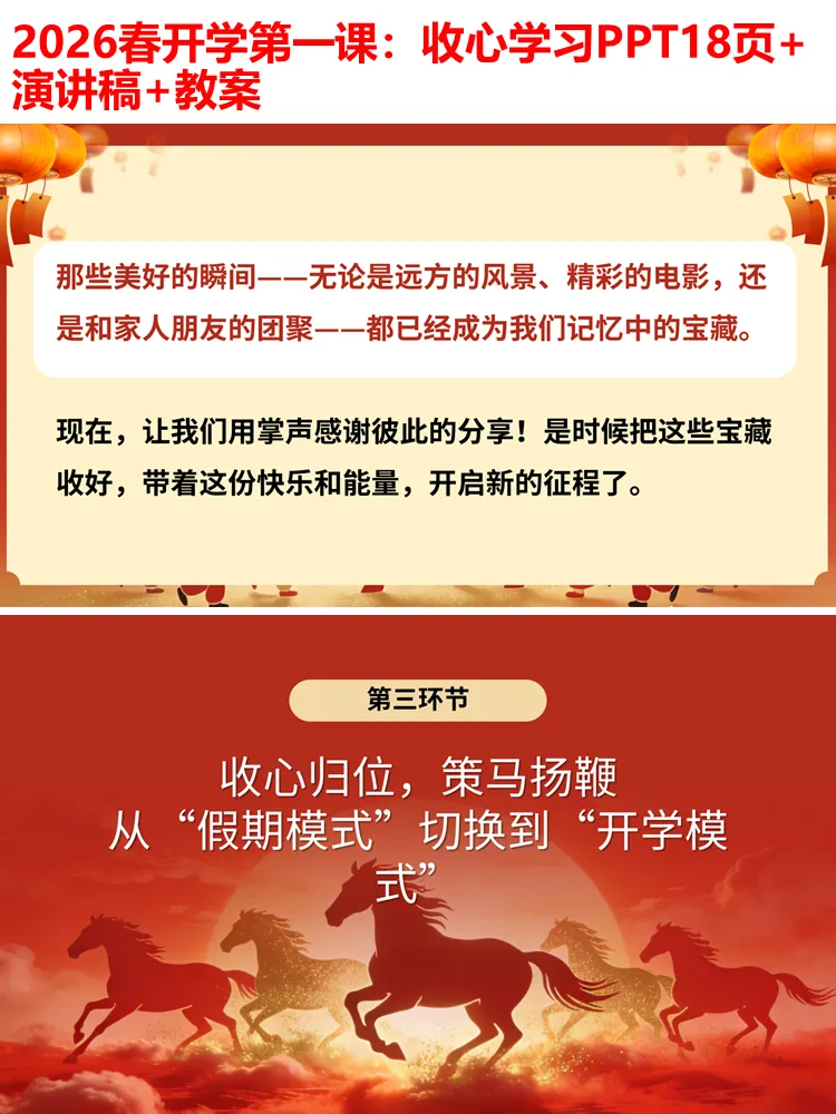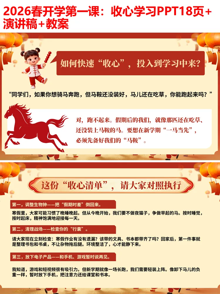 整个PPT环节流畅、逻辑清晰,无需额外修改,可直接用于小学各学段开学第一课、开学主题班会,全程融入马年元素,兼顾趣味性、实用性和教育性,既能帮助学生快速收心,也能传递积极向上的学习态度,为新学期的开启奠定良好基础。