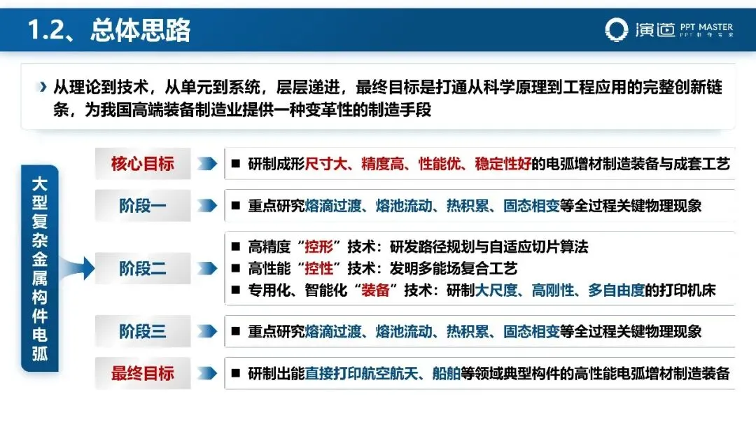 PPT 以 “项目背景 — 总体思路 — 技术创新” 为主线,先阐明高端装备制造的战略意义与传统工艺的局限性,再明确 “从理论到工程应用” 的三阶段实施路径,最后从智能控形、主动控性两大维度呈现核心突破,逻辑清晰、重点突出,精准契合省科奖对技术原创性与工程实用性的评审要求。