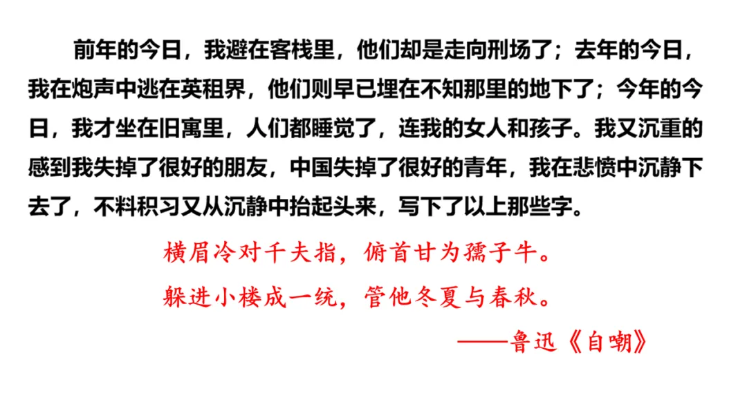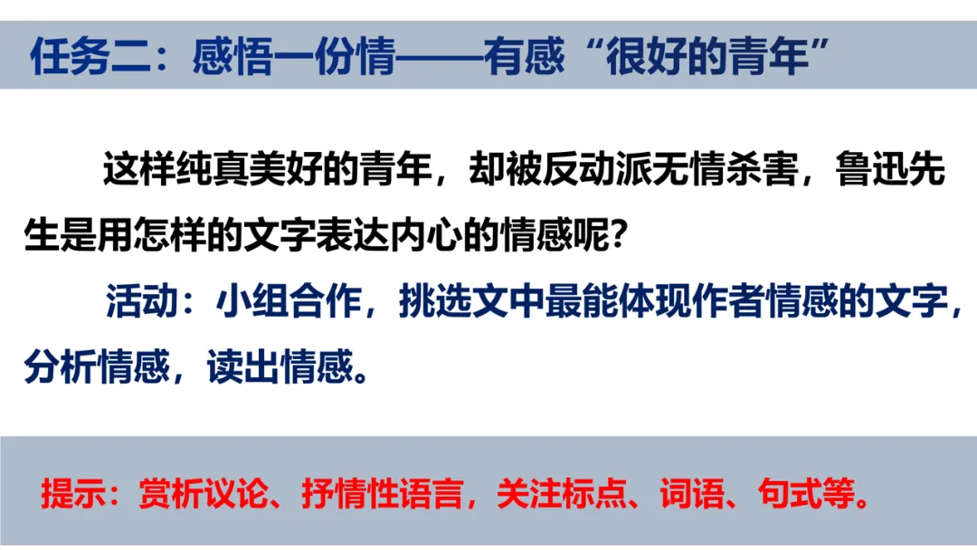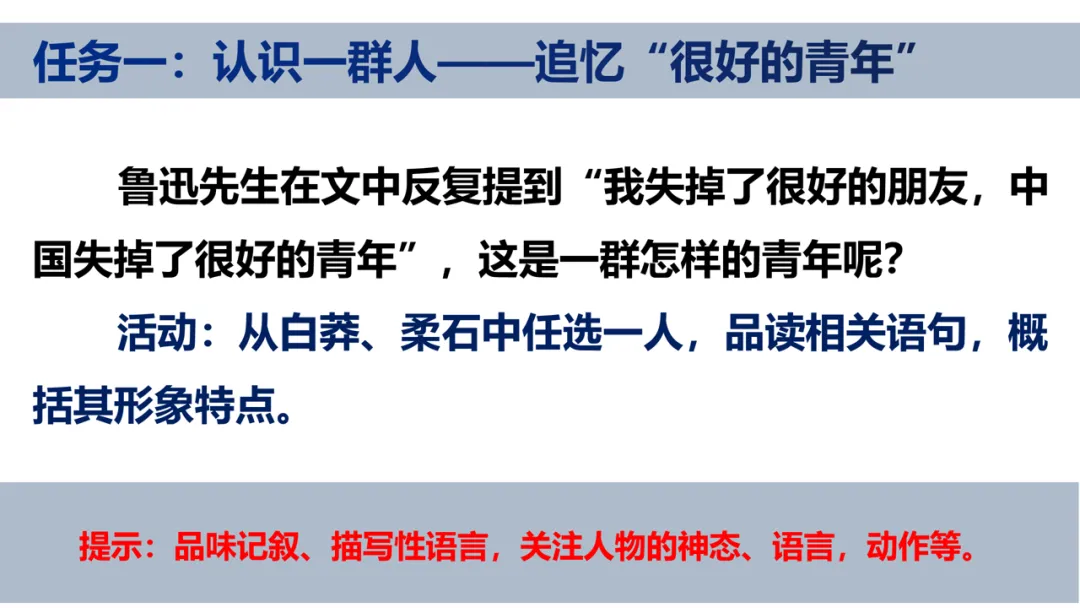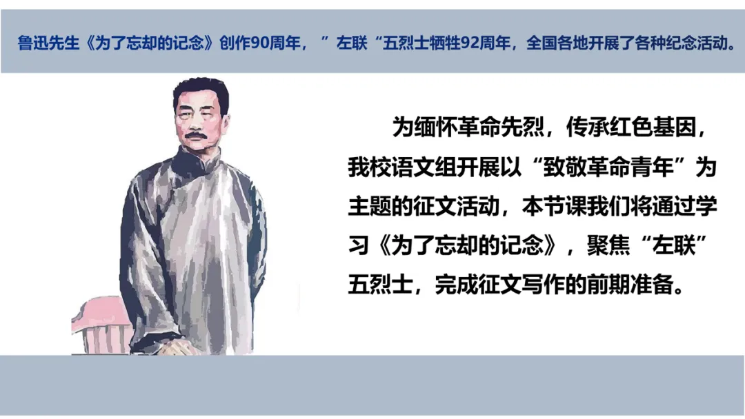 《为了忘却的记念》是鲁迅先生为纪念“左联五烈士”而写作的文章,作者选取一些看似零碎却很能表现人物性格的小事,勾勒出烈士的崇高形象,可以引导学生分析人物形象,感悟革命青年的美好品质。本文的语言含义深刻,写法上体现了记叙、议论、抒情的浑然结合,可以引导学生反复朗读,欣赏鲁迅特有的文字表达风格。作者在文中反复提及“中国失掉了很好的青年”,可以引导学生认识作者笔下的青年之“好”,思考自己应当成为一个怎样“好”的青年,理解革命文化的精神内涵,明确当代青年的使命与担当。群统领下的单课学习是完成单元学习任务的关键一环,应成为学生后续学习的示范与样板,基于以上考虑,具体教学设计如下。