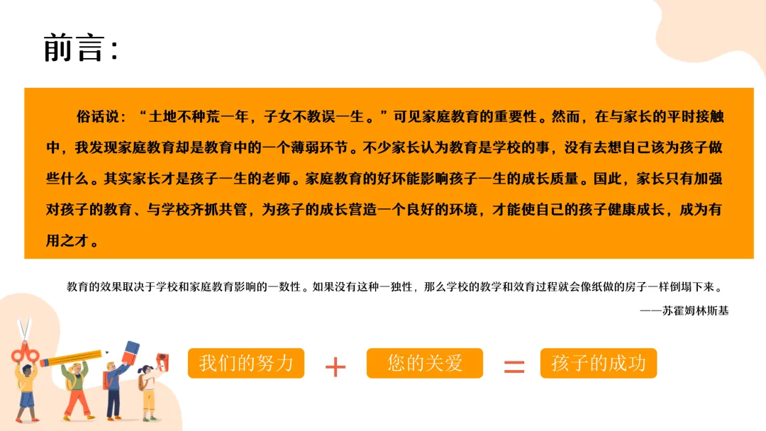 教育的效果取决于学校和家庭教育影响的一数性。如果没有这种一独性,那么学校的教学和效育过程就会像纸做的房子一样倒塌下来。