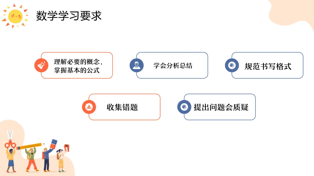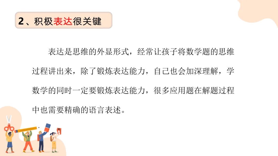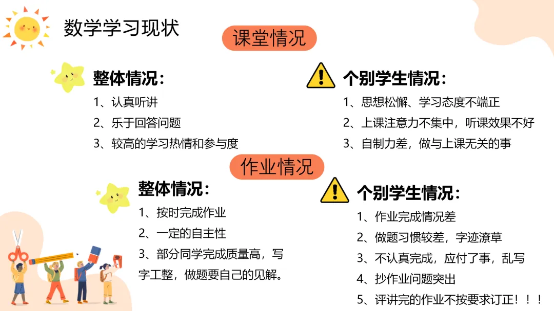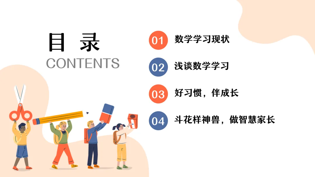 本次家长会分为4个板块进行:数学学习现状;浅谈数学学习;好习惯,伴成长;斗花样神兽,做智慧家长。