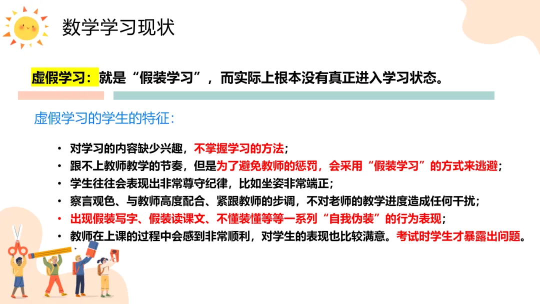 ①对学习的内容缺少兴趣,不掌握学习的方法;②跟不上教师教学的节奏,但是为了避免教师的惩罚,会采用“假装学习”的方式来逃避;③学生往往会表现出非常尊守纪律,比如坐姿非常端正;④察言观色、与教师高度配合、紧跟教师的步调,不对老师的教学进度造成任何干扰;⑤出现假装写字、假装读课文、不懂装懂等等一系列“自我伪装”的行为表现;⑥教师在上课的过程中会感到非常基础较差的同学如何来解决?我的想法是鼓励和帮助。1.告诉孩子,没有谁天生学习就好,数学不是一切,他们每个人有许许多多的优点。我知道你也想学好数学,只是现在遇到了一些困难,让我们一起来看看都是些什么困难,制定计划一点点去解决。然后家长们真的请走进孩子了解孩子,不要只是看到他空那么多没做,错那么多,应该坐下来和孩子一起分析一点点来解决。