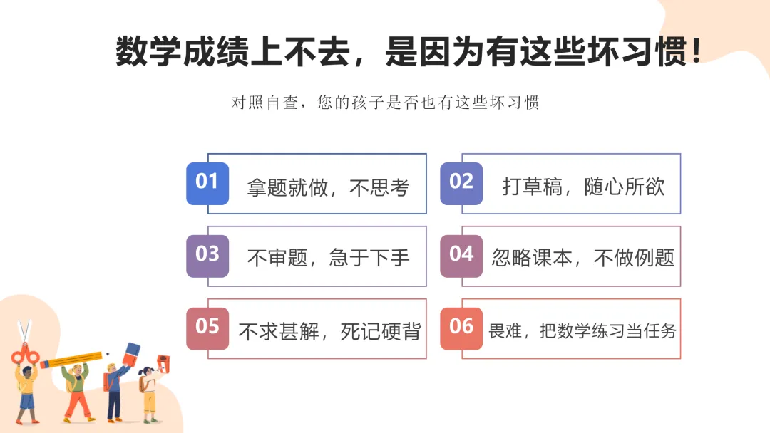很多孩子数学成绩上不去,是因为有这些坏习惯!请家长们对照自查一下,您的孩子是否也有这些坏习惯: