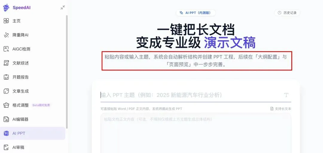 1、我们只需要输入主题就可以让 SpeedAI 完成制作 PPT 工作全流程。SpeedAI 的信息源非常丰富,可以基于我们的想法、文件、知识库,也支持搜索全网素材或学术资料。
