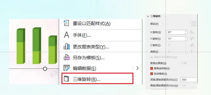 3,接着点击图表,给图表设置三维旋转,同时设置图表的间隙宽度调整到合适的位置,具体参数可以参考下图: