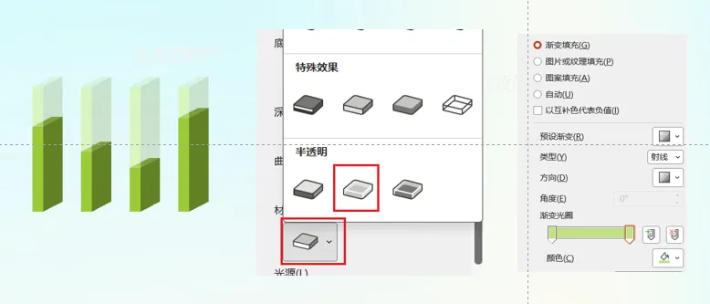 4,点击上半部分的绿色,右键设置渐变填充,接着点击三维格式,在材料中选择半透明,得到下图的效果。