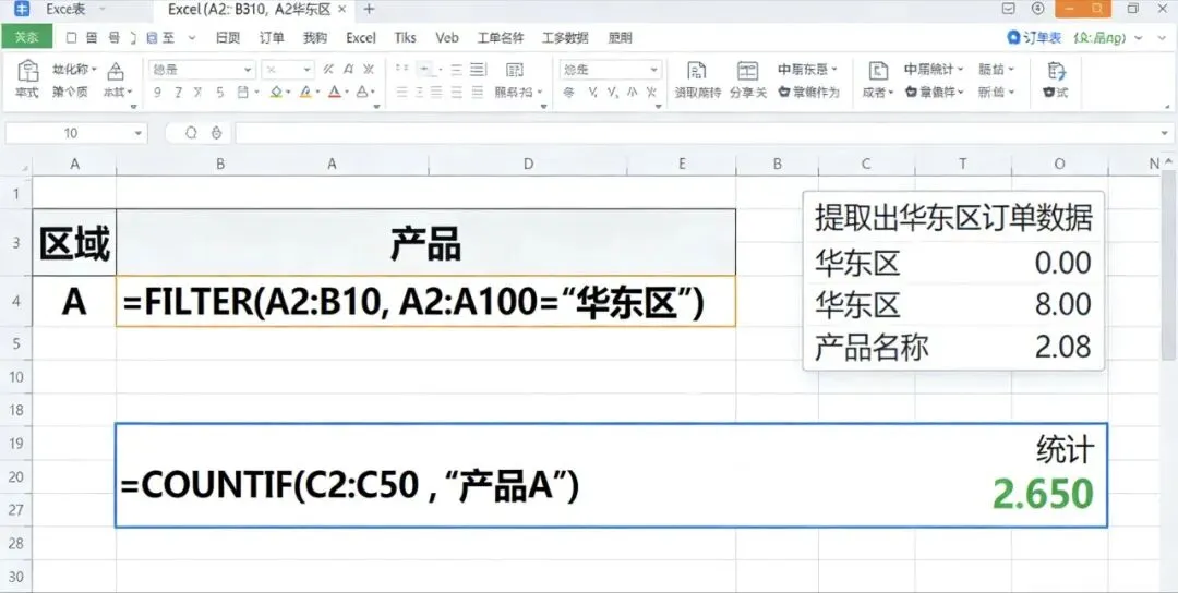 技巧解析:先用 FILTER 提取出华东区的订单明细,再用 COUNTIF 针对提取结果进行计数。