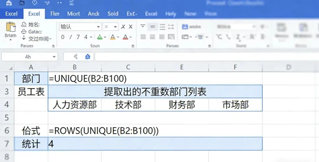技巧解析:UNIQUE 函数自动提取区域内的不重复值,ROWS 函数则统计这个去重数组的行数,直接得出最终总数。