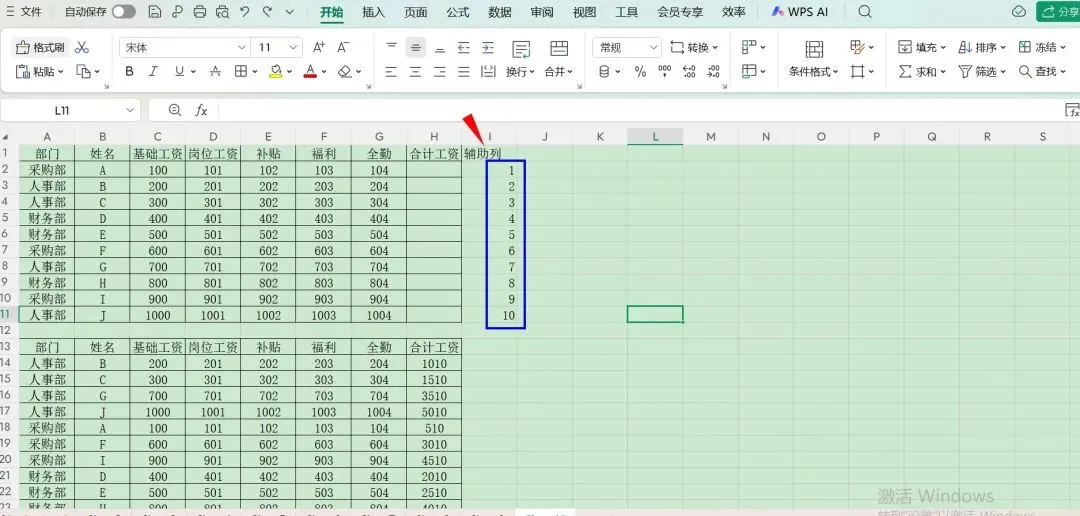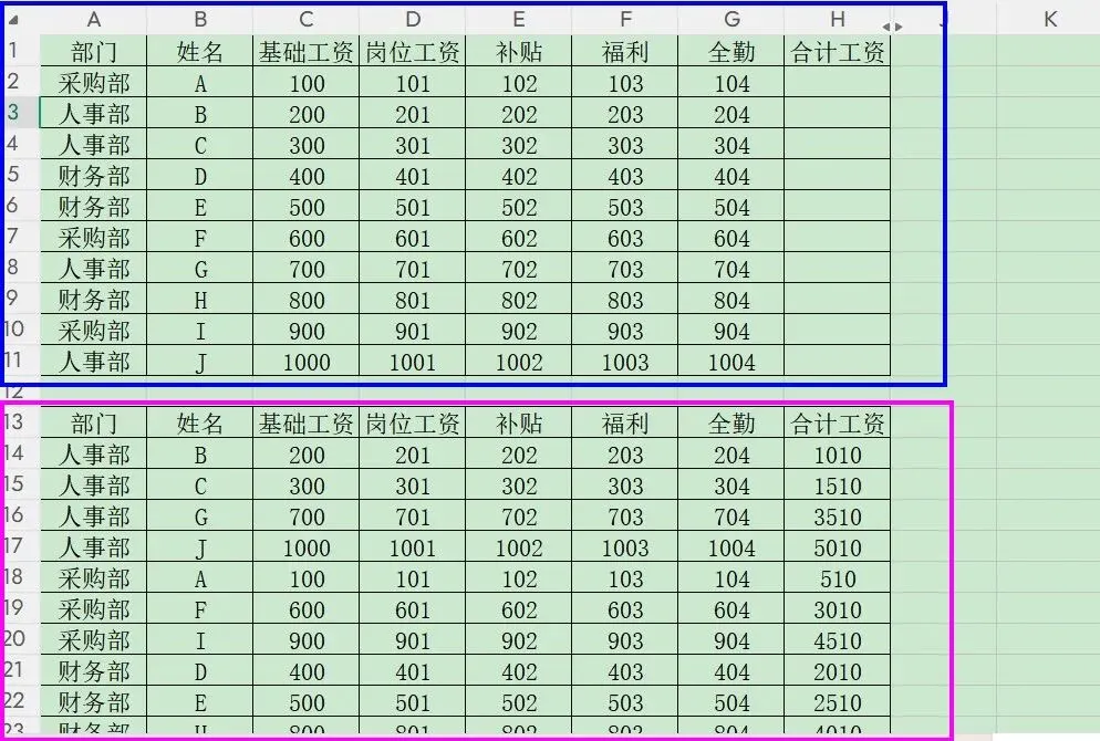 这是工作中经常用到的功能,以下图的表格为例,如果要把紫色方框里人事部的合计工资,粘贴到蓝色方框里的人事部合计工资里,有两个方法。