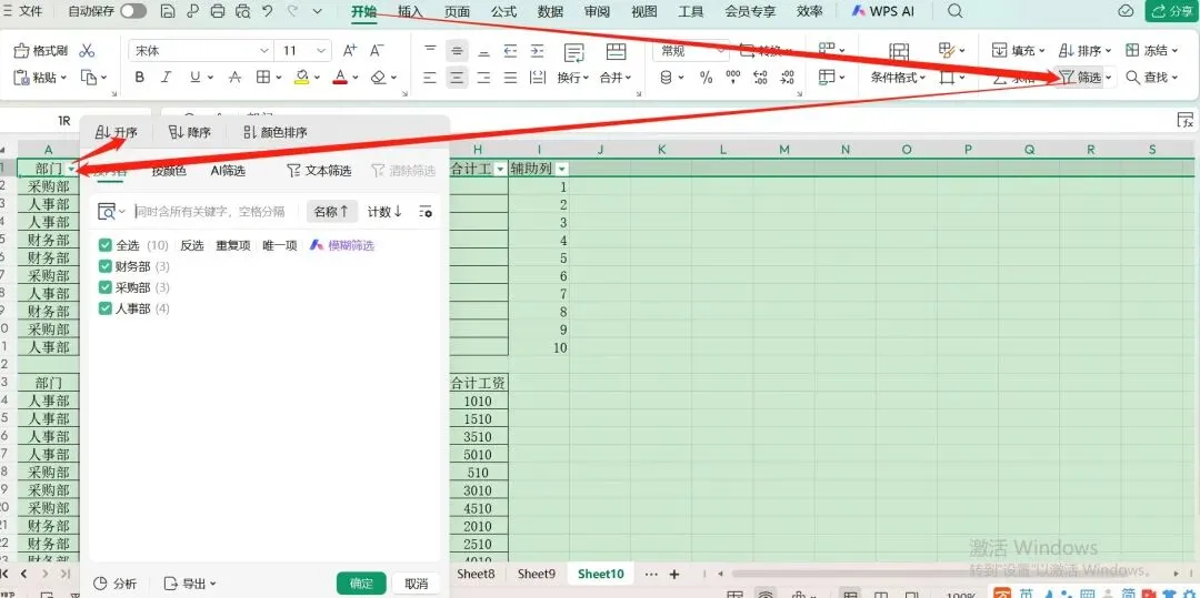 接着,在上面表格的“部门”处进行“”筛选”,点击”降序“或者“升序”都可以,我这里随机点击“升序”。