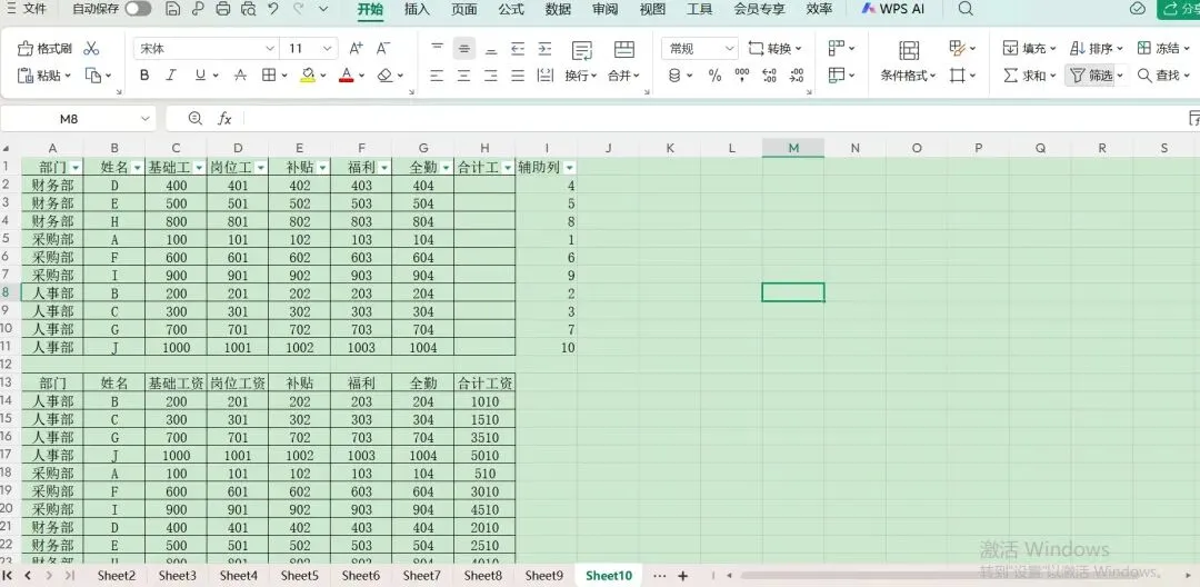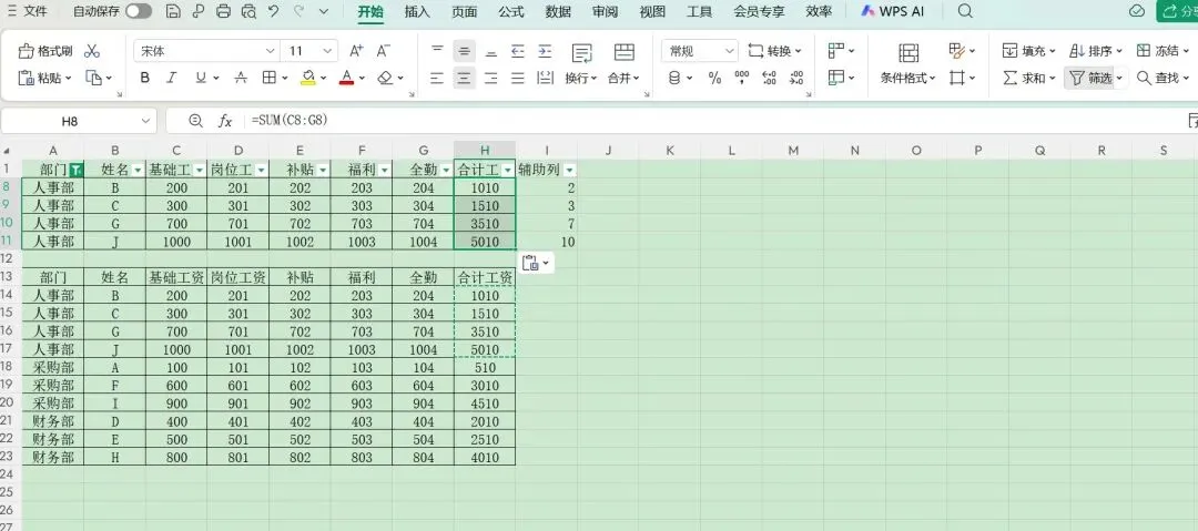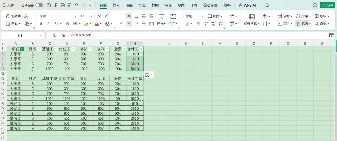 接着,在上面表格的“部门”处继续筛选“人事部”,并将下面表格的人事部的“合计工资”粘贴到上面表格的“合计工资”处,即完成了此次筛选后的粘贴。