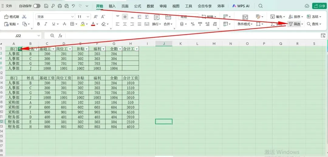 还有一个更简便的方法,不需要用到“辅助列”,直接将上面表格进行“筛选”,选择“人事部”。