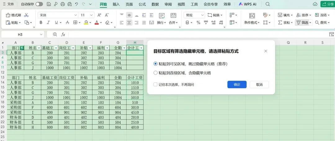 接着,将下面表格里“人事部”的“合计工资”全部复制,然后“粘贴”到上面表格“人事部”对应的“合计工资”里,紧接着就会弹出一个对话框,选择第一个选项即“ 粘贴到可见区域,跳过隐藏单元格(推荐)”,即可完成筛选后的粘贴。