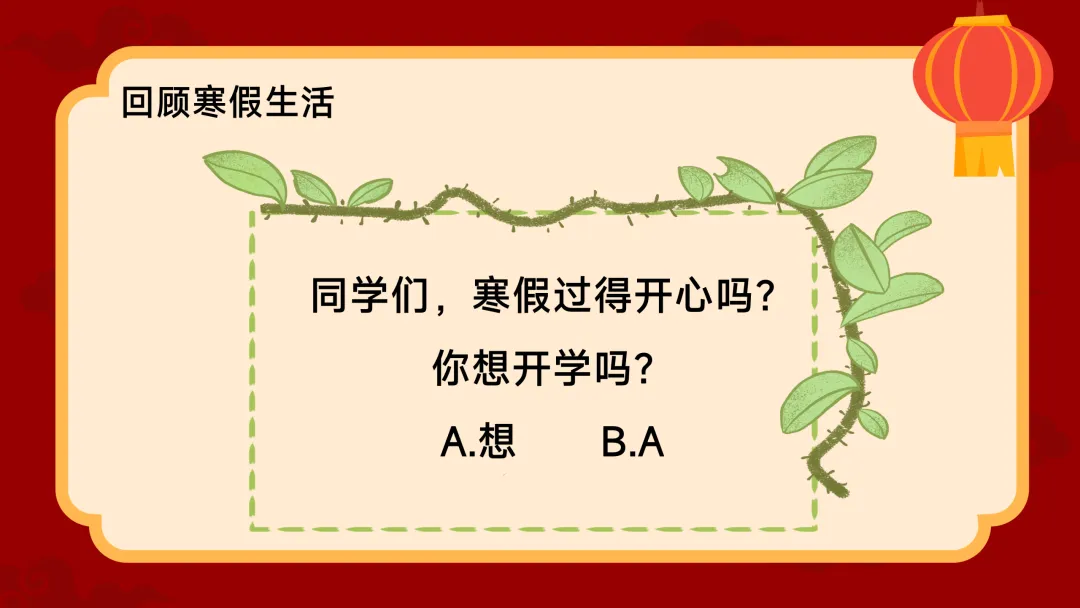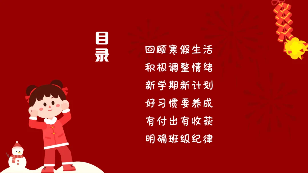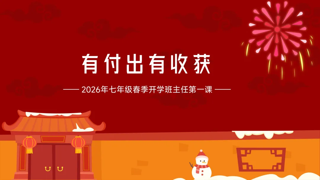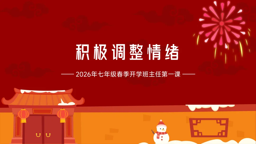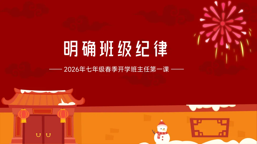 (展示PPT第1-2页)班主任:同学们,大家早上好!看着大家一张张精神饱满的脸庞,感受着春天的气息,欢迎大家回到校园!过了一个热热闹闹的春节,咱们迎来了2026年七年级春季开学 。今天是我们新学期的班主任第一课 。 这节课,我们将围绕六个关键词展开:回顾寒假生活、积极调整情绪、新学期新计划、好习惯要养成、有付出有收获、最后是明确班级纪律 。准备好开启我们的新旅程了吗?