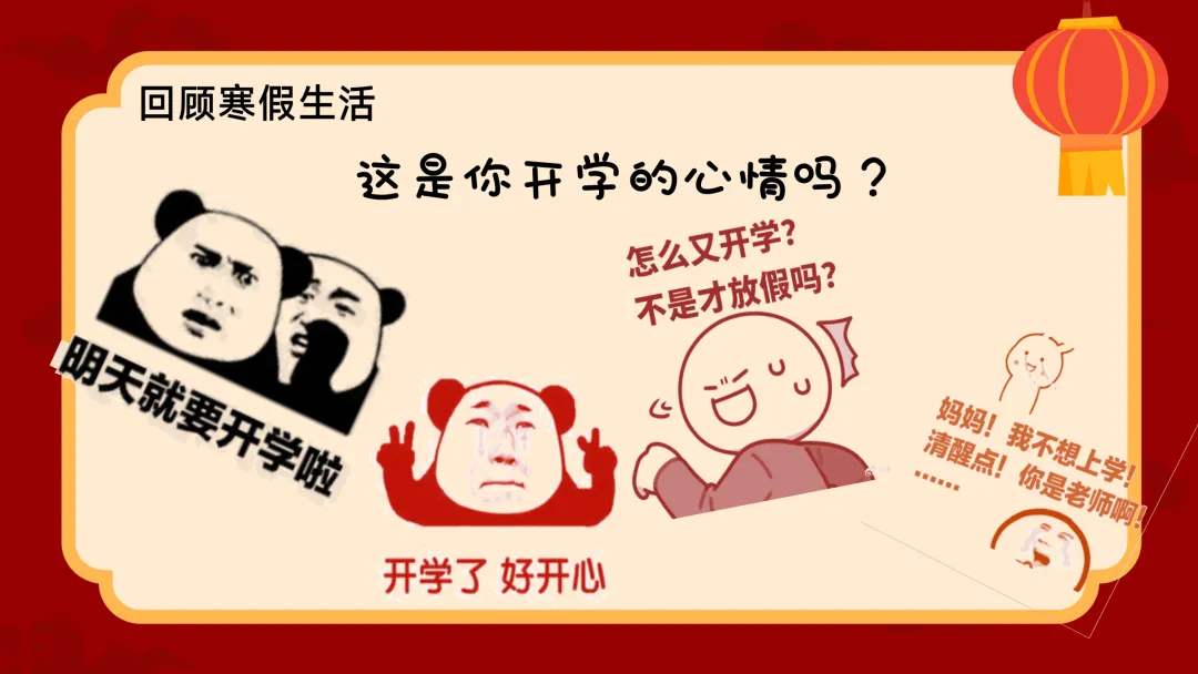 (展示PPT第6-7页)班主任:刚才大家笑得很开心,但老师知道,昨天晚上很多同学的真实心情其实是这样的——“怎么又开学?不是才放假吗?”甚至有的同学在被窝里喊:“妈妈!我不想上学!”结果妈妈回了一句:“清醒点!你是老师啊!!” 哈哈,老师也是人,老师和你们一样,也会有“开学综合征”。 大【第二部分:积极调整情绪】(约5分钟)