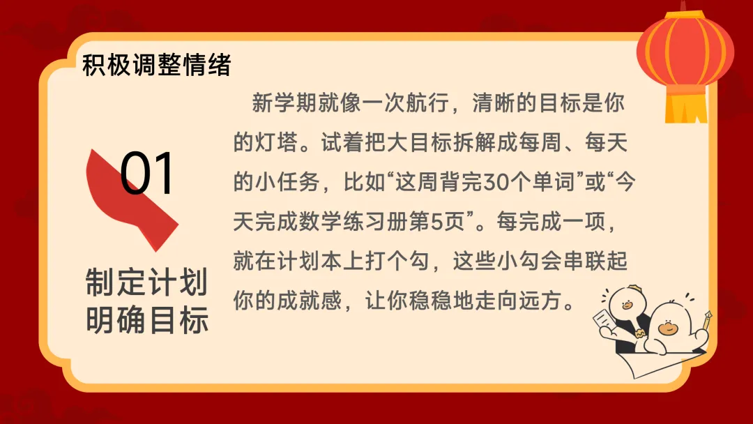 (展示PPT第8-11页)班主任:接下来进入第二部分,积极调整情绪。老师给大家三个小妙招。第一招,制定计划。新学期就像一次航行,清晰的目标就是你的灯塔。大家不要一上来就定个“我要考第一”这样的大目标,试着把它拆【第三部分:新学期新计划】(约12分钟)