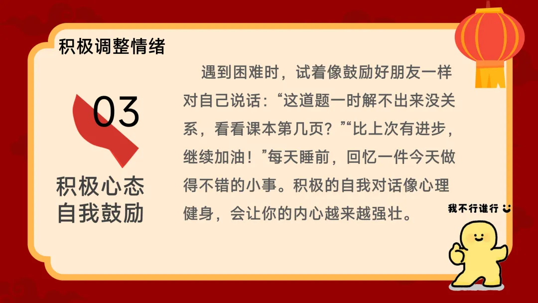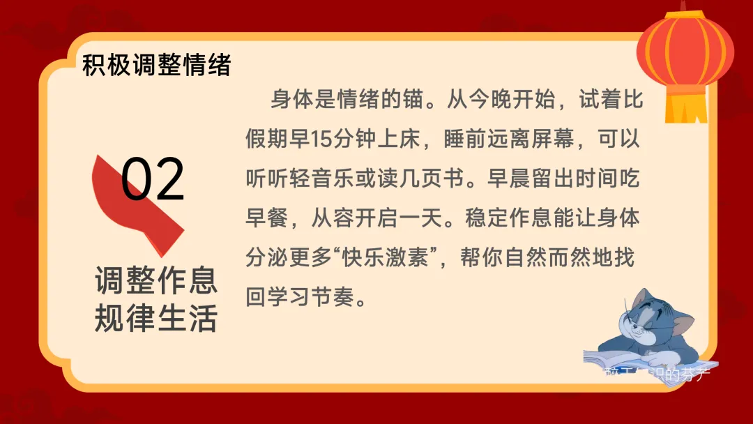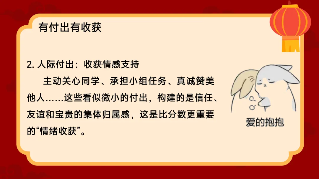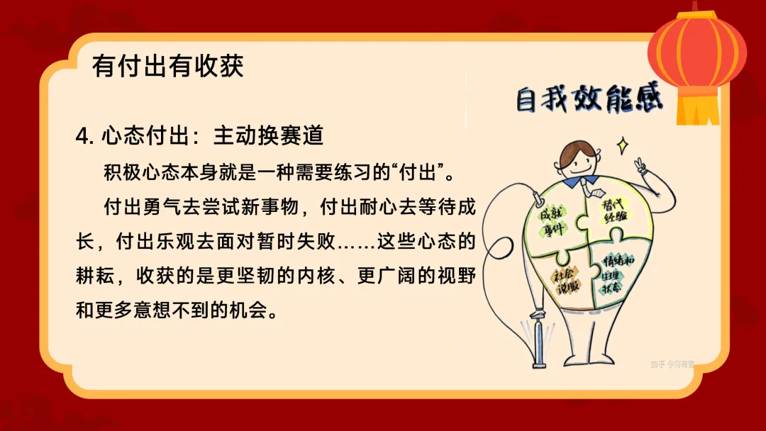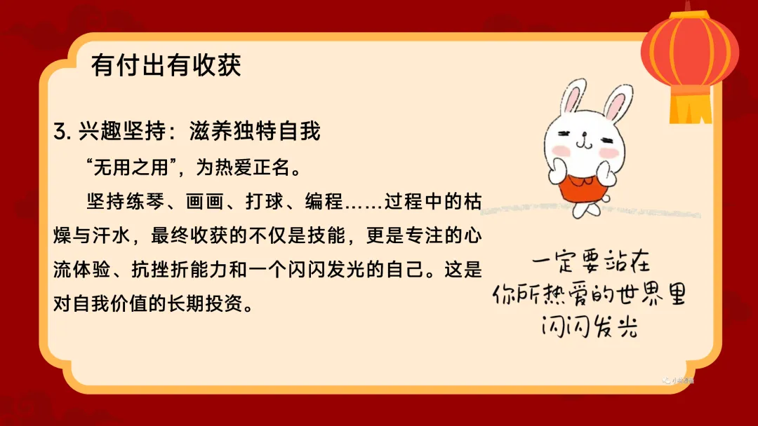 (展示PPT第12-17页)班主任:调整好情绪,我们就要来谈谈新计划了。今年的计划,老师想结合几个人物和现象来给大家一些启发。首先,像哪吒一样,定义属于自己的“我命由我” 。不做被定义的“标签人” 。你可能曾被贴上“偏不被干扰的时间,让它在喧嚣中依然枝繁叶茂。第四,从今年春晚中寻找文化传承的力量。最美的创意植根于传统文化。我们可以从唐诗宋词中学习凝练表达,从古代工匠精神里领悟专注。把文化底蕴融入生活,你的个人故事会更有厚度。最后,面对AI的崛起,我们要成为善用“新工具”的航海家 。AI是新时代的“风与帆”,不要逃避,去思考如何用它辅助学习 。但更重要的是,培养【第五部分:有付出有收获】(约10分钟)