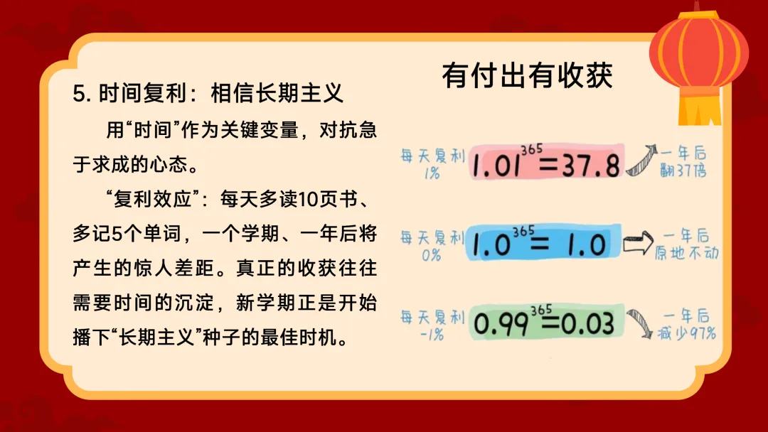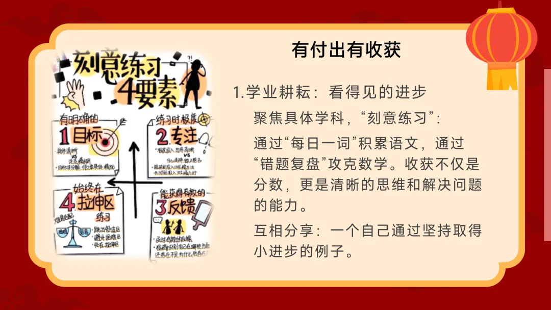 (展示PPT第21-26页)班主任:努力了就一定有回报吗?是的,有付出有收获。但这需要正确的方法。第一是学业耕耘上的“刻意练习” 。它包含4个要素:首先目标要具体清晰,不能泛泛而谈 ;其次练习时要极度专注,不要一步一点点,每天复利 $0.99^{365} = 0.03$,一年后就会几乎原地踏步甚至倒退 。这就是长期主义的力量 。用时间作为关键变量,对抗急于求成的心态吧 。