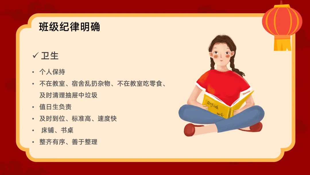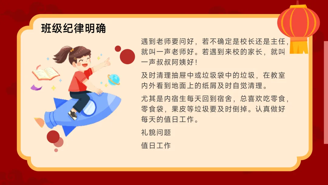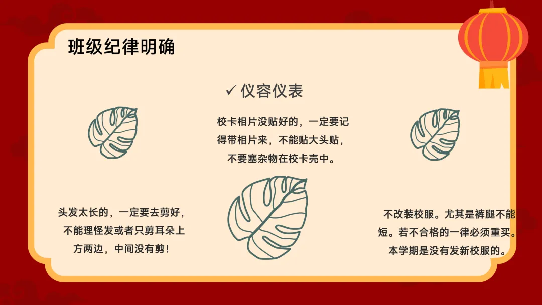 杂物、吃零食,及时清理抽屉。值日生要标准高、速度快。宿舍的床铺书桌要整齐有序。特别是内宿生,零食袋、果皮等垃圾要及时倒掉。第三是仪容仪表。校卡相片必须贴好,不能贴大头贴,壳里不准塞杂物。头发太长的周末赶紧去剪,不准理怪发。不准改装校服,裤腿不能短,不合格的一律重买。第四是礼貌。在校园里遇到老师要问好,不确定是哪位领导就大方地叫“老师