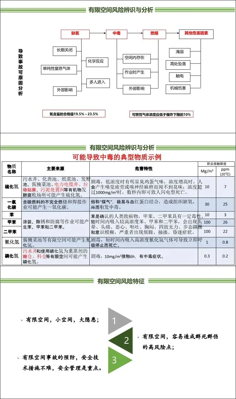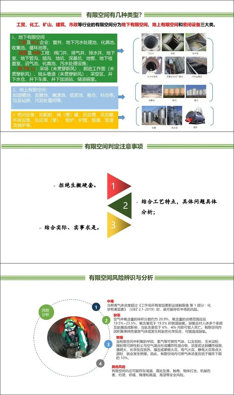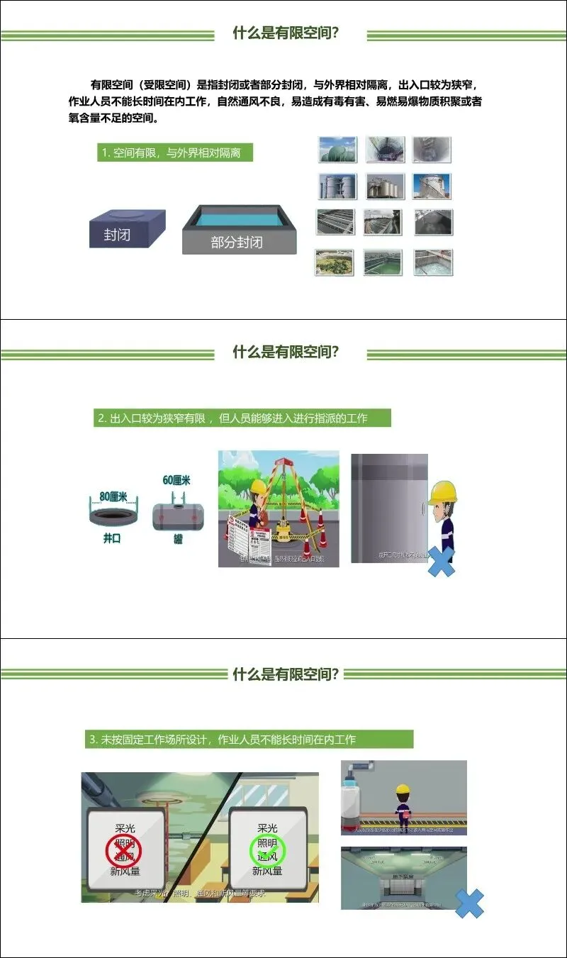 定义与特征:有限空间是指封闭或部分封闭、与外界相对隔离、出入口狭窄、非固定工作场所设计、自然通风不良,易造成有毒有害、易燃易爆物质积聚或氧含量不足的空间。