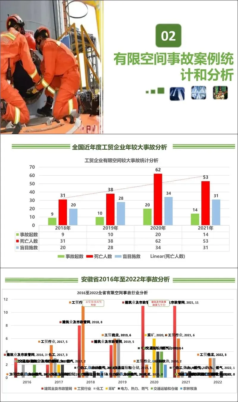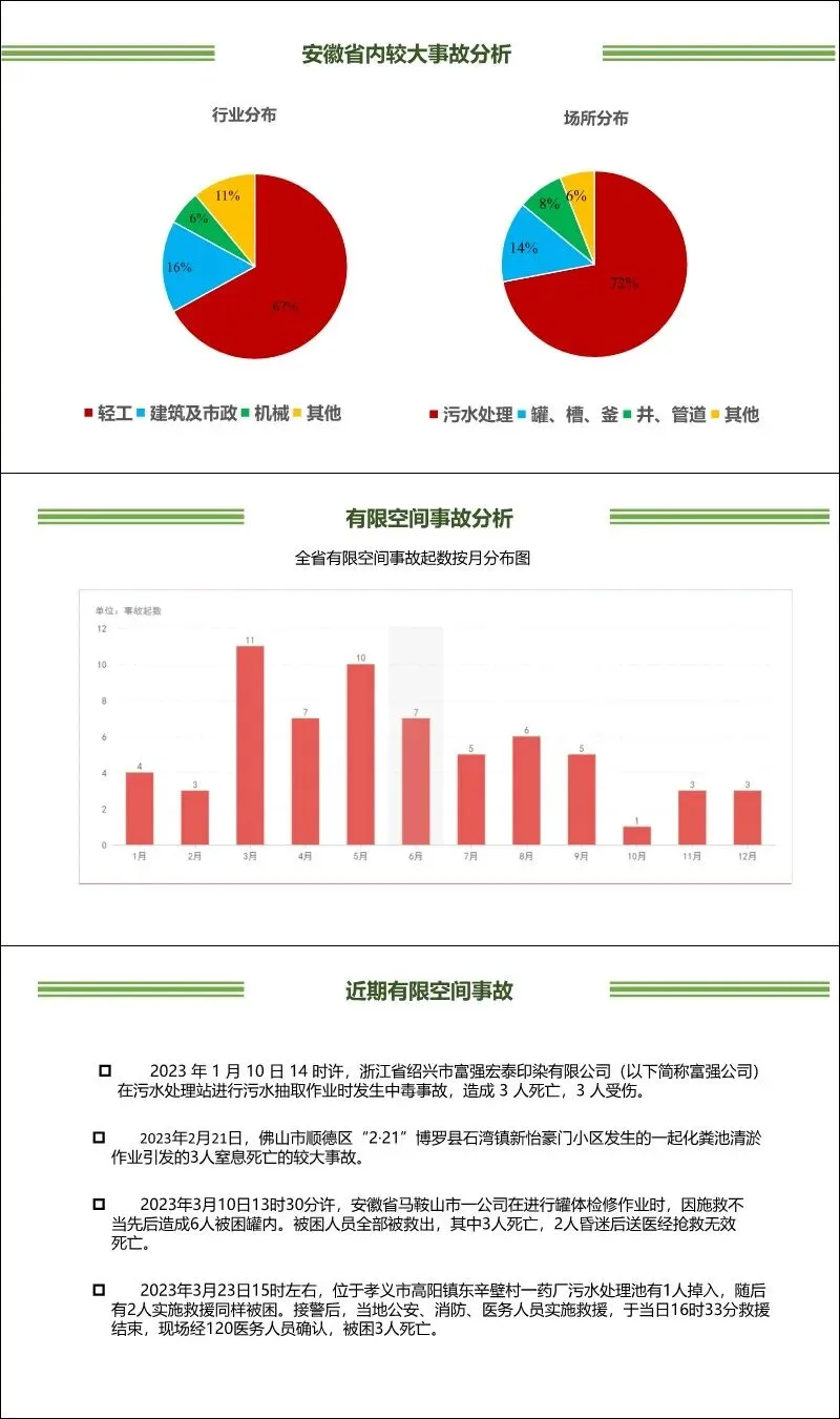 数据统计:分析了全国及安徽省近年来的工贸企业有限空间较大事故。数据显示,3-9月为事故高发期,硫化氢中毒占比最高(约46%),盲目施救导致伤亡扩大的情况普遍。