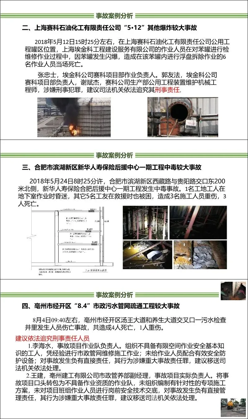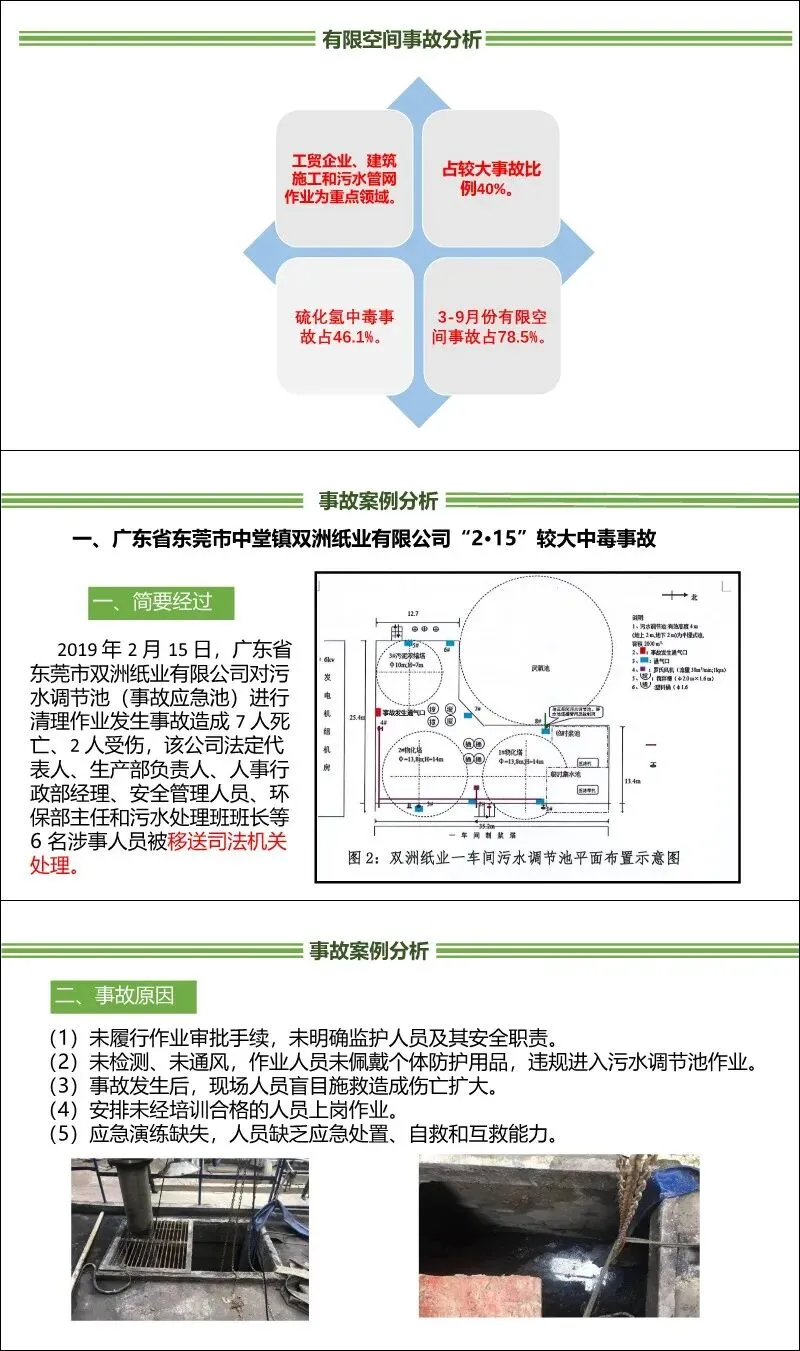 典型案例:列举了多起典型事故,如广东东莞“2·15”造纸厂污水池中毒事故(7死2伤)、上海赛科“5·12”苯罐闪爆事故(6死)、四川长宁食品厂中毒窒息事故(7死)等。
