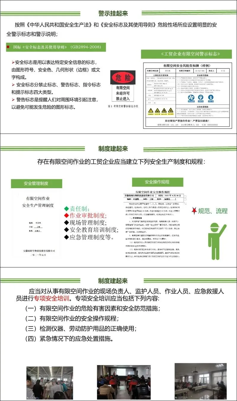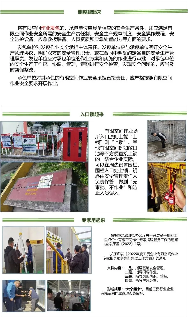 制度建起来:建立责任制、审批制度、操作规程、培训制度和应急管理制度;对相关人员(负责人、监护人、作业人员、救援人员)进行专项培训。