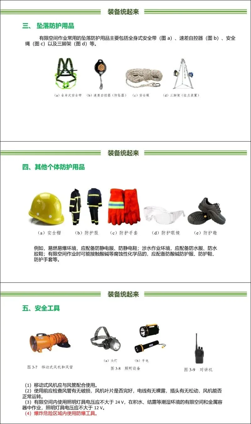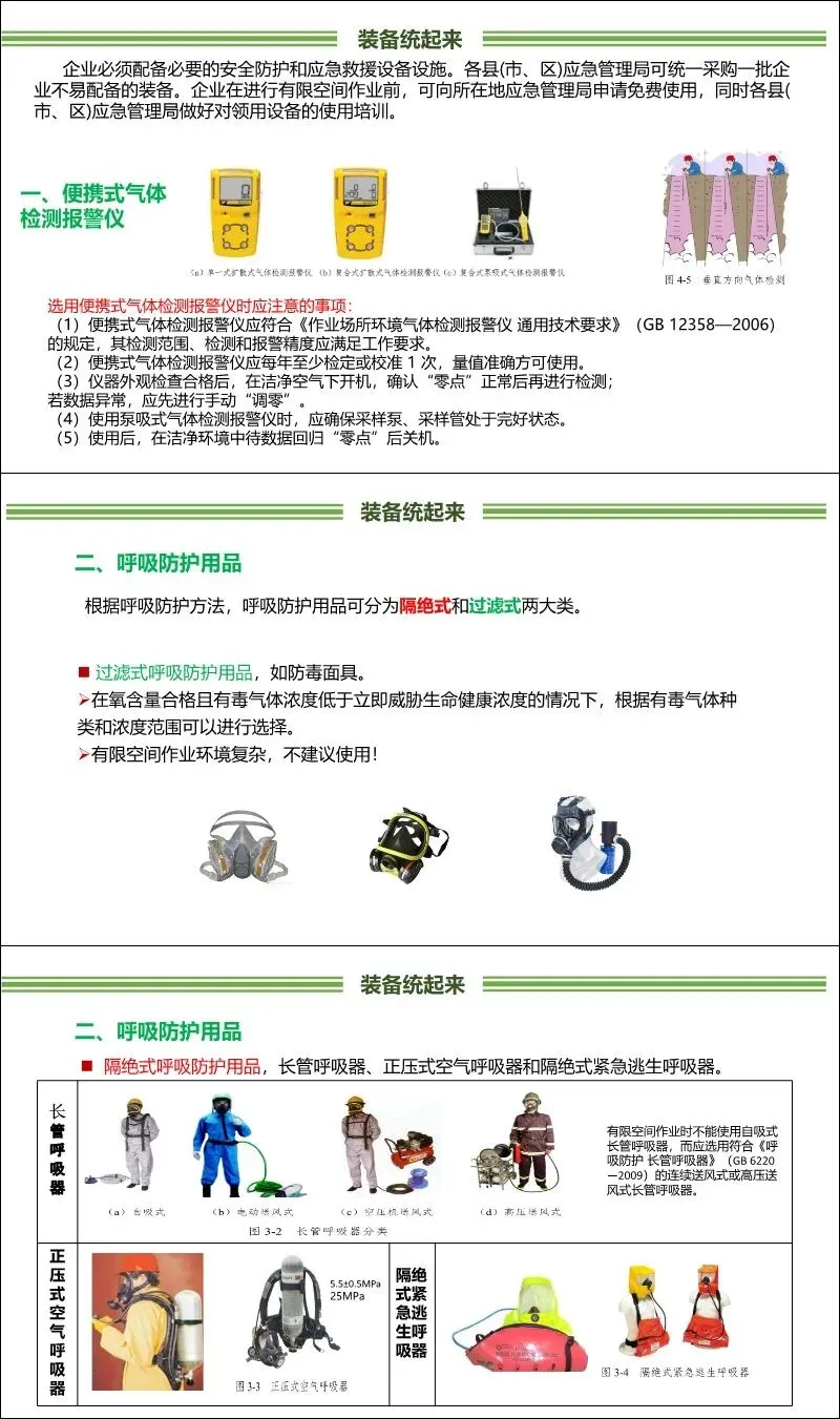 装备统起来:配备并统一管理气体检测仪、呼吸防护用品(推荐隔绝式,如正压式空气呼吸器、连续送风长管呼吸器,不建议使用过滤式)、坠落防护装备(三脚架、安全带)、防爆工具及通风照明设备。