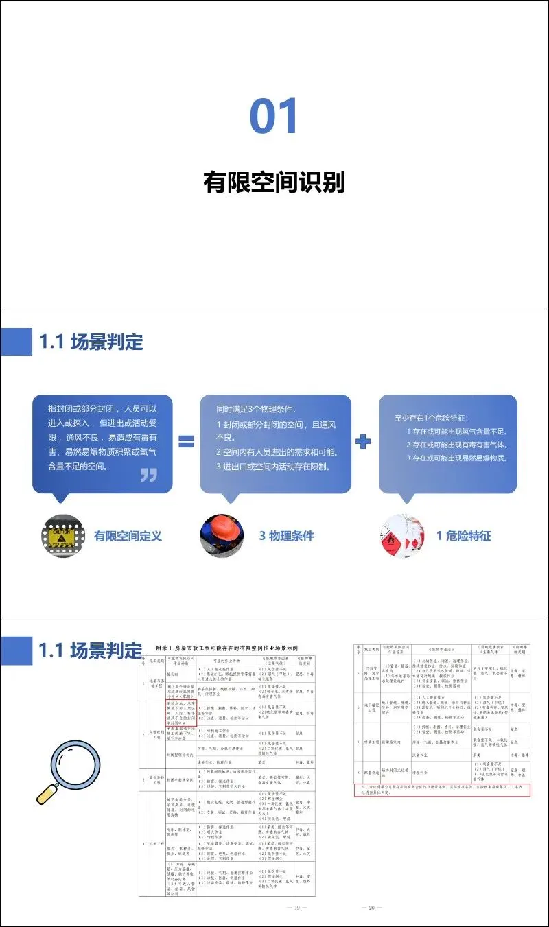 判定条件: 需同时满足3个物理条件(封闭/半封闭且通风不良、有人员进出需求、进出受限)和至少1个危险特征(缺氧、有毒有害气体、易燃易爆物质)。