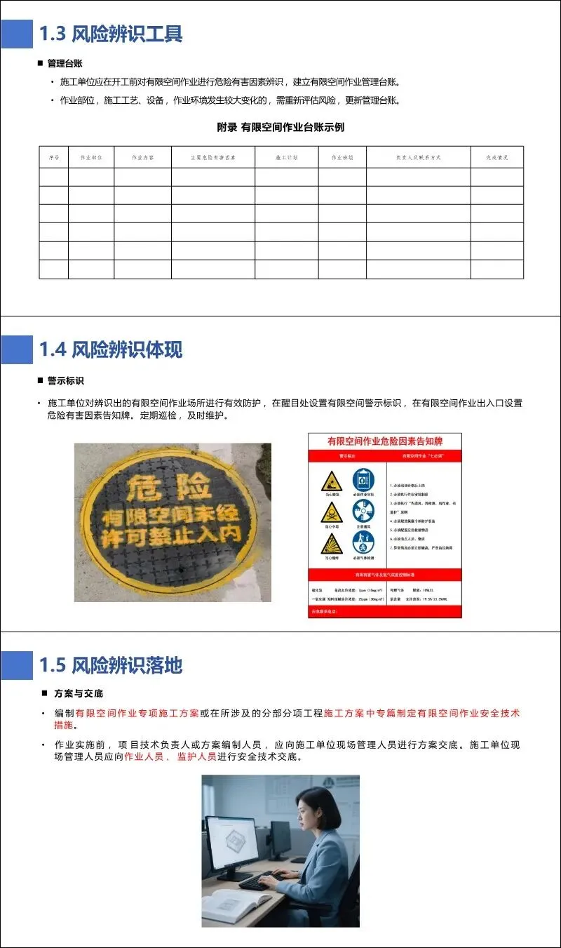 开工前辨识: 施工单位需在开工前全面评估风险,建立有限空间作业管理台账。