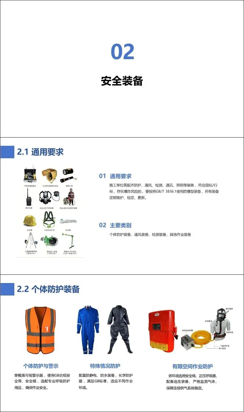 个体防护: 包括高可视警示服、安全带、安全帽,以及根据环境选择的正压式空气呼吸器或长管呼吸器(严禁在缺氧环境使用自吸过滤式防毒面具)。