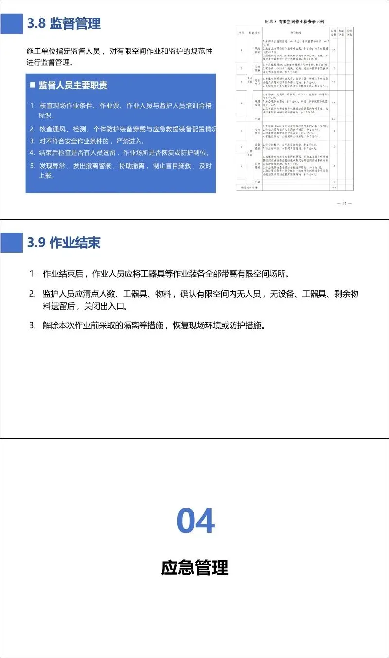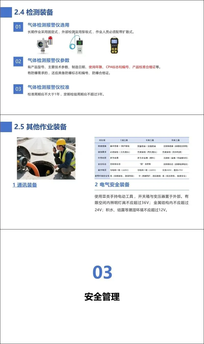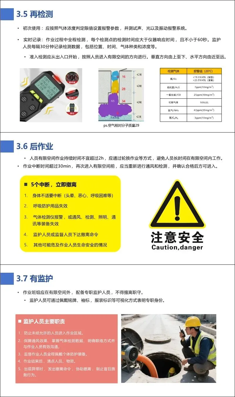 后作业: 确认合格后方可进入。单次作业时间不宜超过2小时,中断超过30分钟需重新通风检测。出现身体不适、设备报警等5种情况立即撤离。