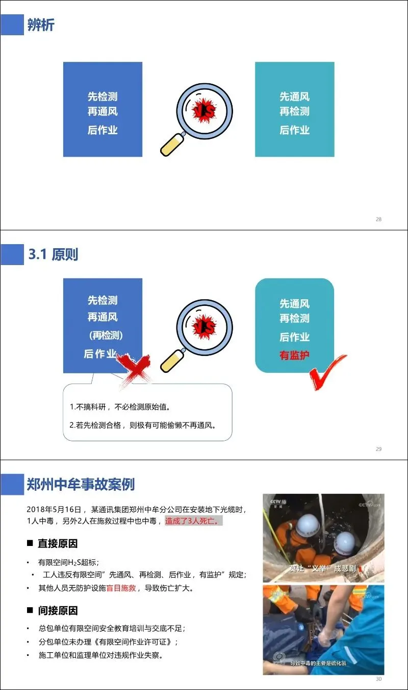 再检测: 通风后进行检测,遵循“由上至下、由近至远”原则。检测指标包括氧含量、硫化氢、一氧化碳、可燃气体等。作业中需全程实时检测,每30分钟记录一次。