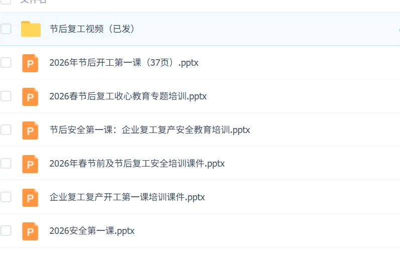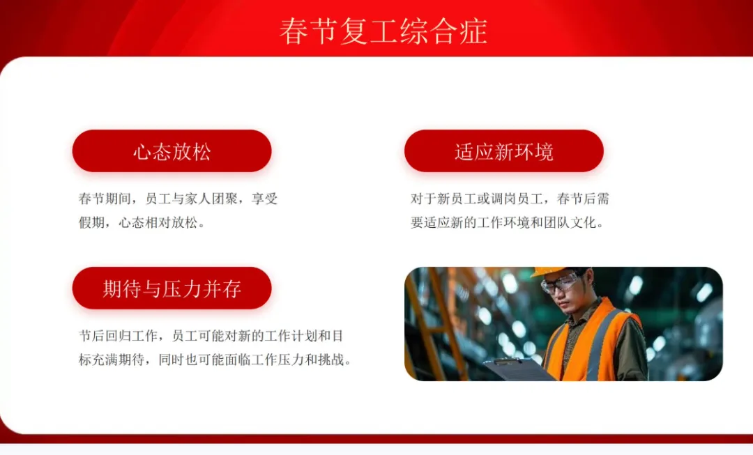 2026年春节后假期过完了。很多企业单位正月初八上班了,除了有开工红包和新年祝贺,但我们企业安全复工培训内容少不了,这里给大家整理了企业安全复工复产培训内容PPT给大家参考,可以修改后进行讲课展示。资料来源于网络,仅供大家参考学习。