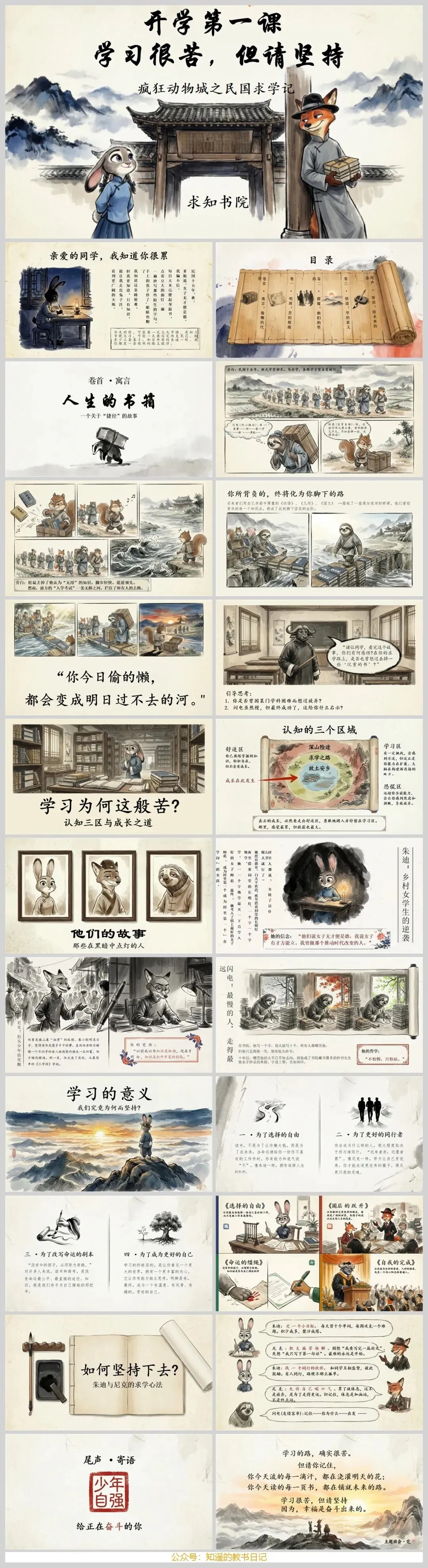 这份PPT设计得超用心,它将民国背景与《疯狂动物城》的经典角色巧妙融合,通过一个“求学过河”的寓言故事开场,瞬间就能抓住学生们的注意力。🐰🦊故事里,松鼠的“捷径”和闪电的“坚持”形成鲜明对比,生动地传递出 “你所背负的,终将化为你脚下的路” 这一核心信念,引导孩子们思考坚持的意义。